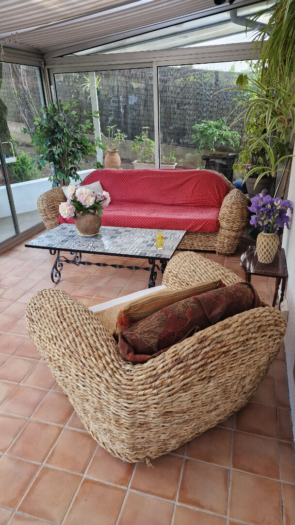 Une entrée dessert une cuisine aménagée et équipée et un séjour traversant, lumineux, avec une ouverture côté rue sur le balcon et, côté jardin, une véranda exposée plein sud, une chambre également exposée plein sud, donne directement sur la véranda,