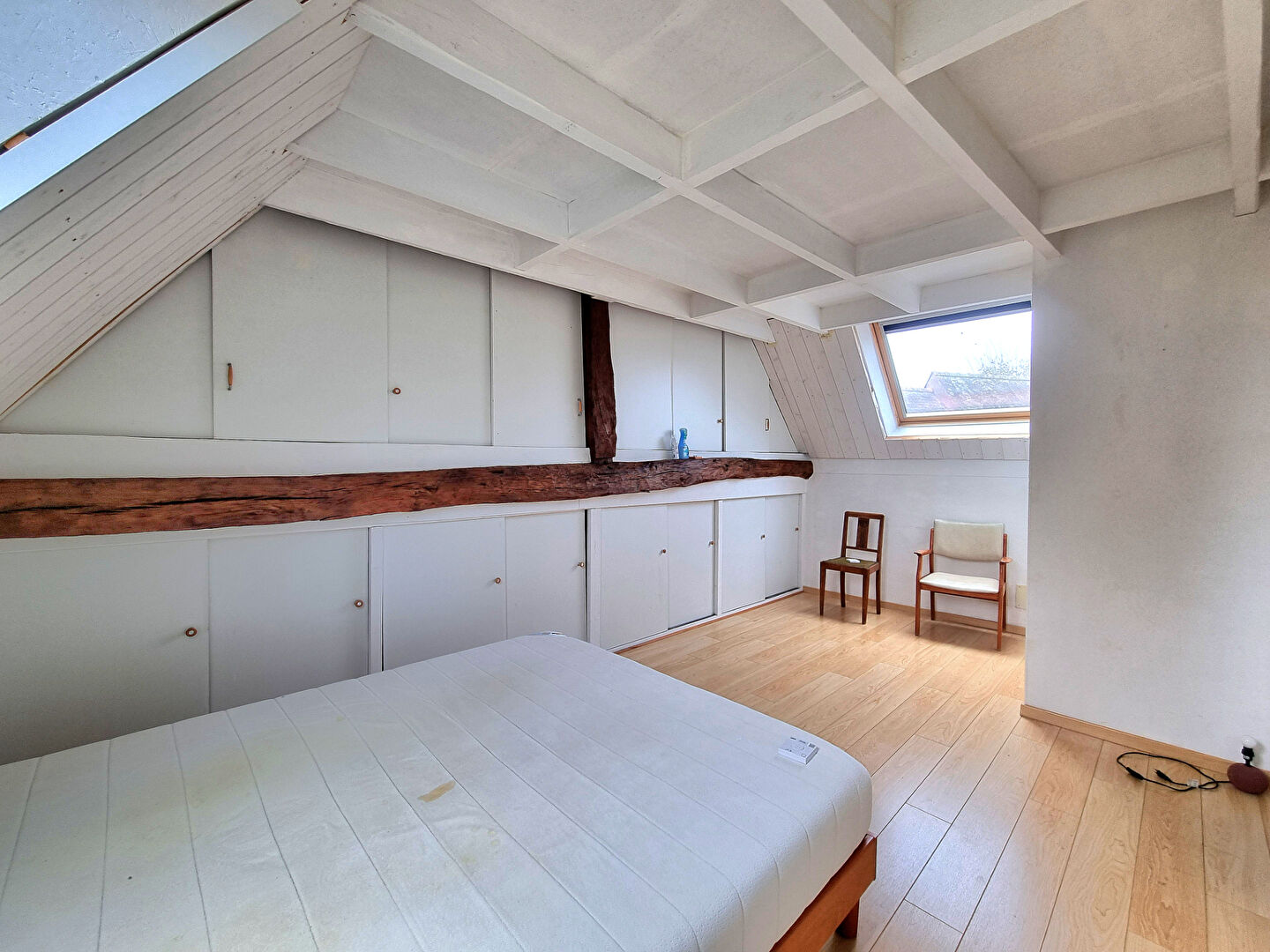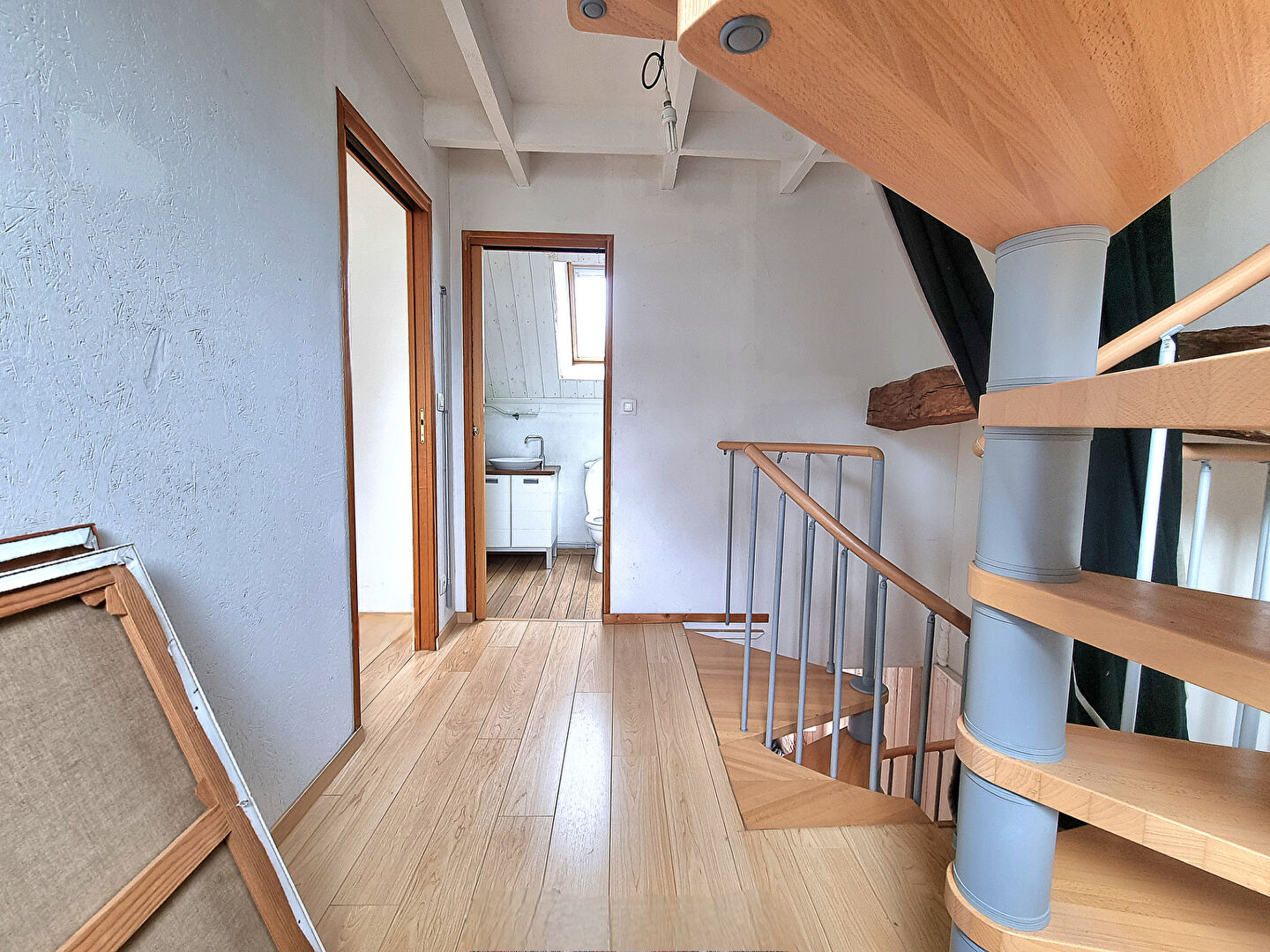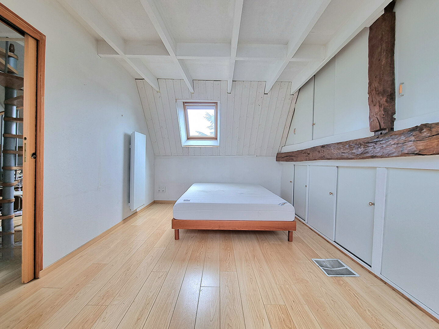 À l'étage, un palier distribue une chambre spacieuse avec plusieurs placards intégrés, ainsi qu'une salle d'eau avec WC.