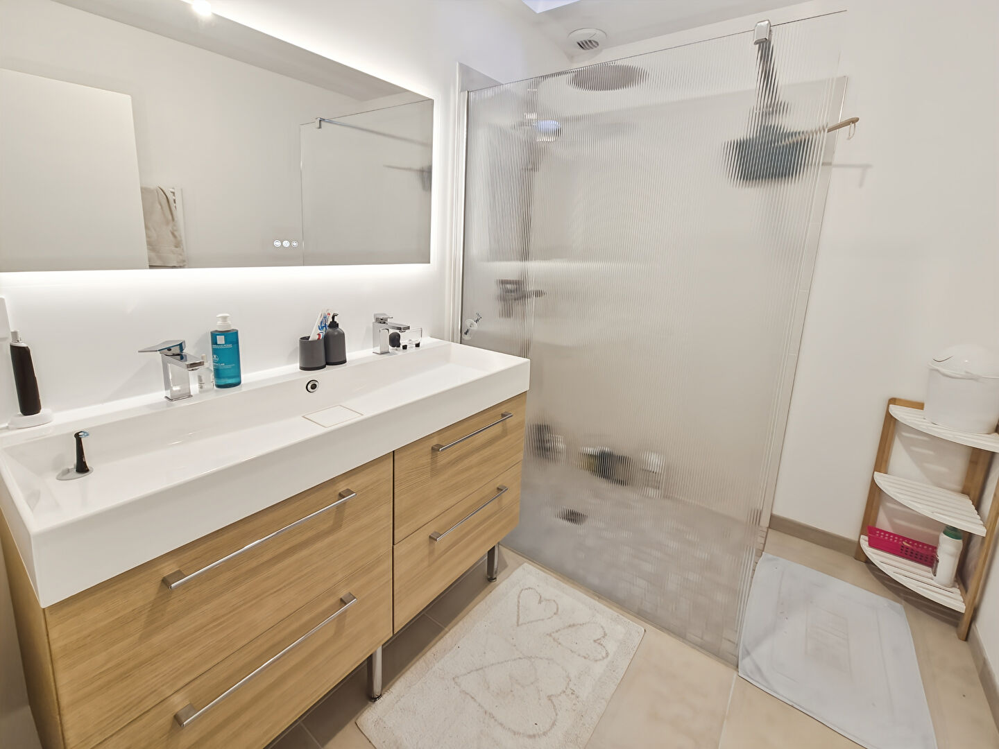 Elle se compose d'une entrée desservant une pièce de vie lumineuse, d'une cuisine aménagée et entièrement équipée, ainsi que de trois chambres dont une avec dressing. Une salle d'eau moderne et un WC indépendant complètent l'ensemble.