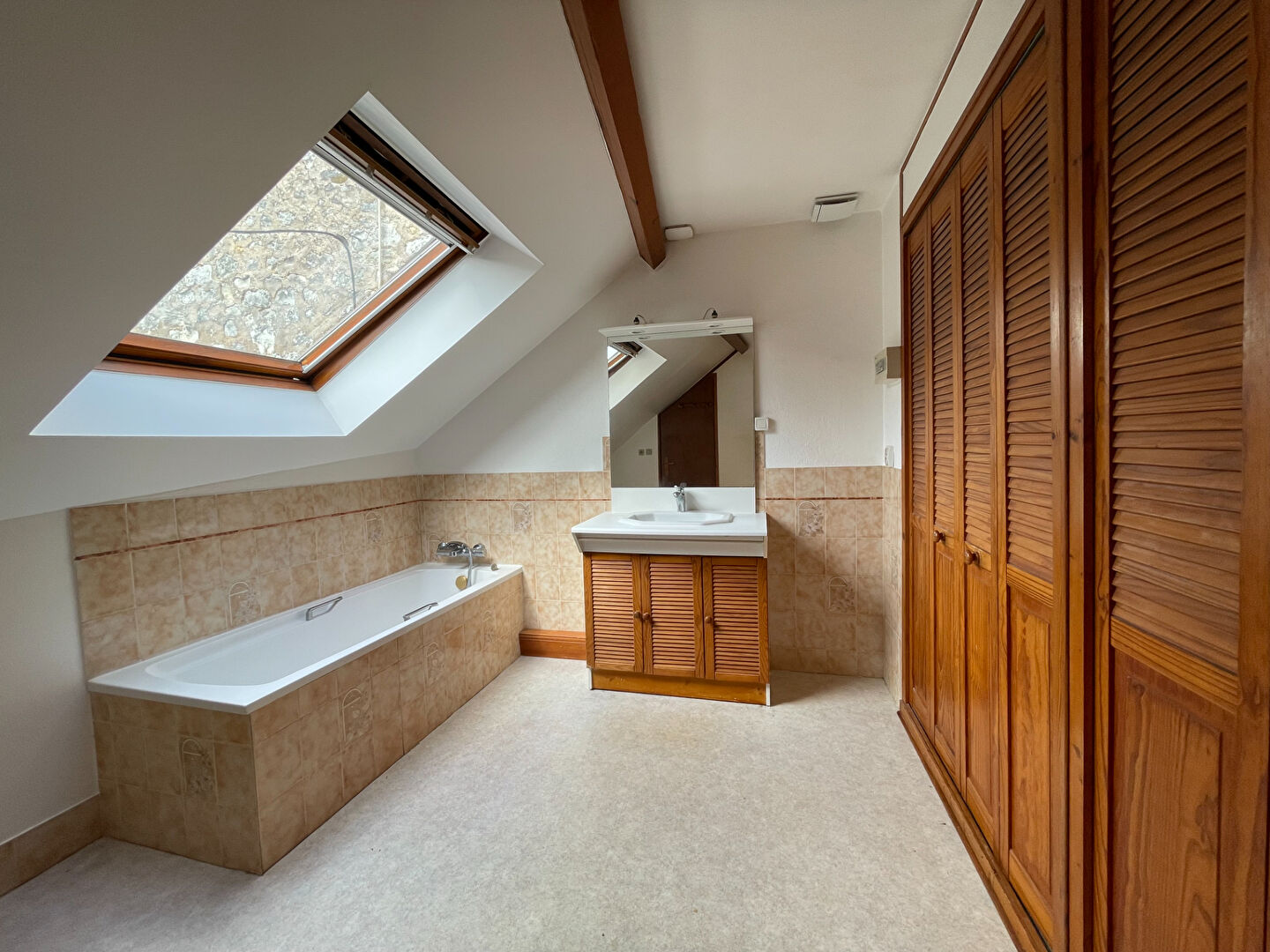 A l'étage : Chambre, salle de bains avec placard penderie.
