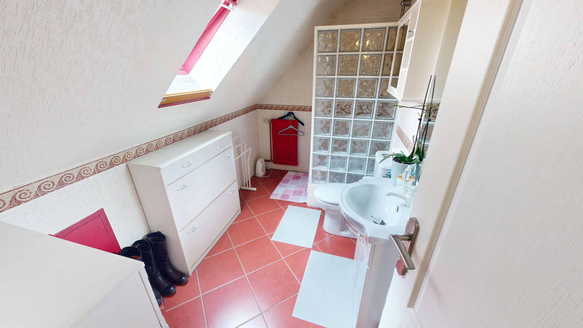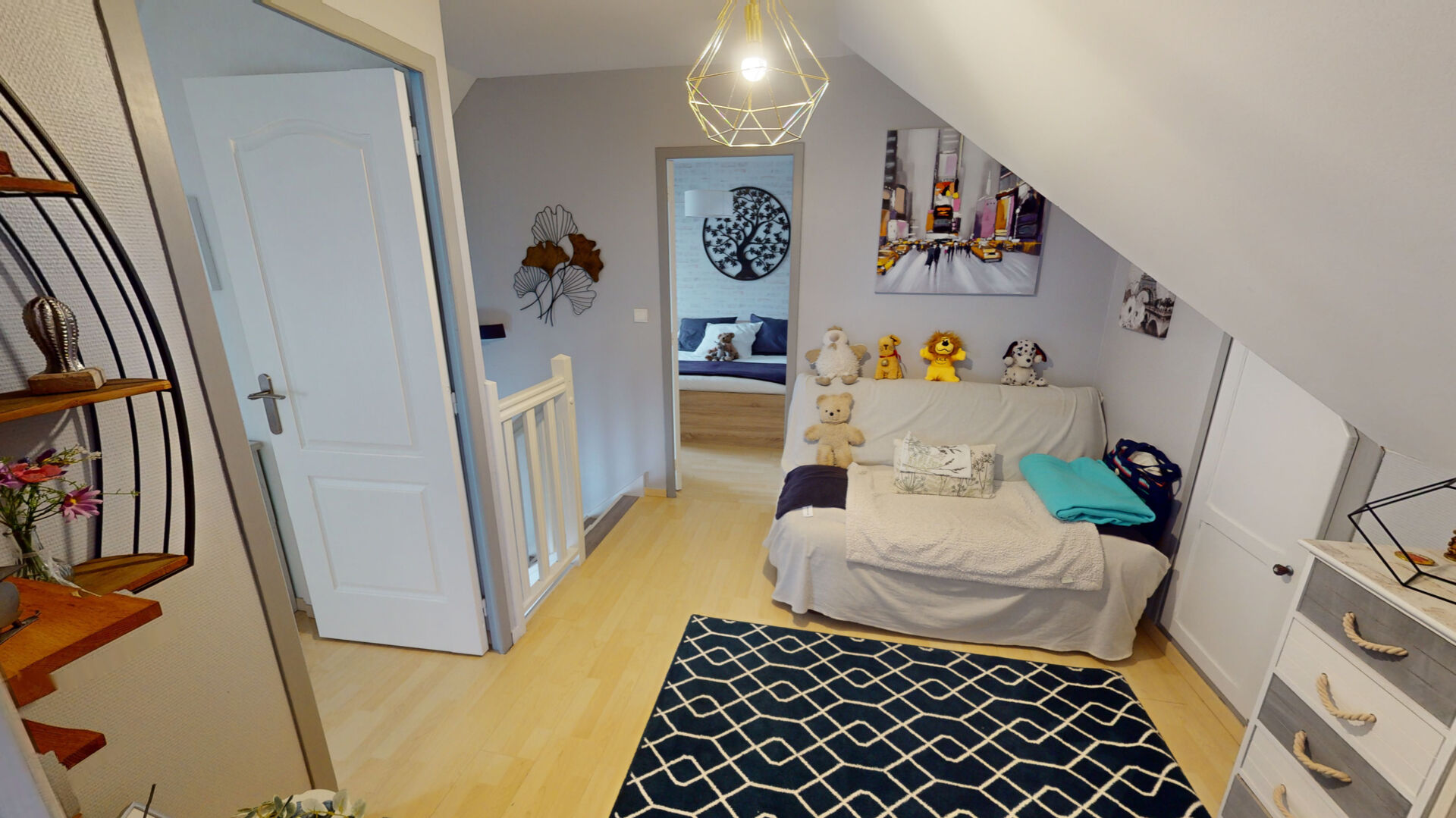 Au premier étage, un palier pouvant faire office de chambre d'appoint donnant accès à une chambre de 13,22m², à une deuxième chambre de 10,25m² et à une salle d'eau avec wc.