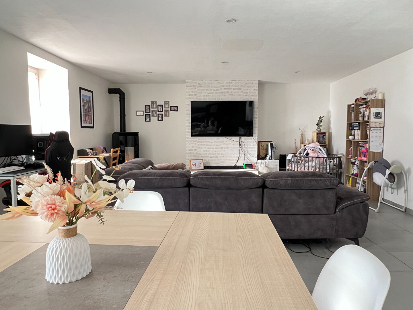 Au rez-de-chaussée, vous profiterez d'une généreuse pièce de vie de près de 68 m², comprenant une cuisine fonctionnelle aménagée et équipée, ouverte sur un salon-séjour lumineux agrémenté d'un poêle à granulés. Vous trouverez également une buanderie et une salle d'eau avec WC.