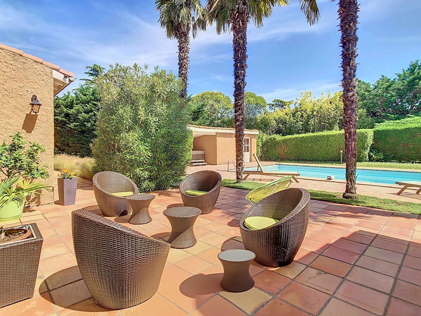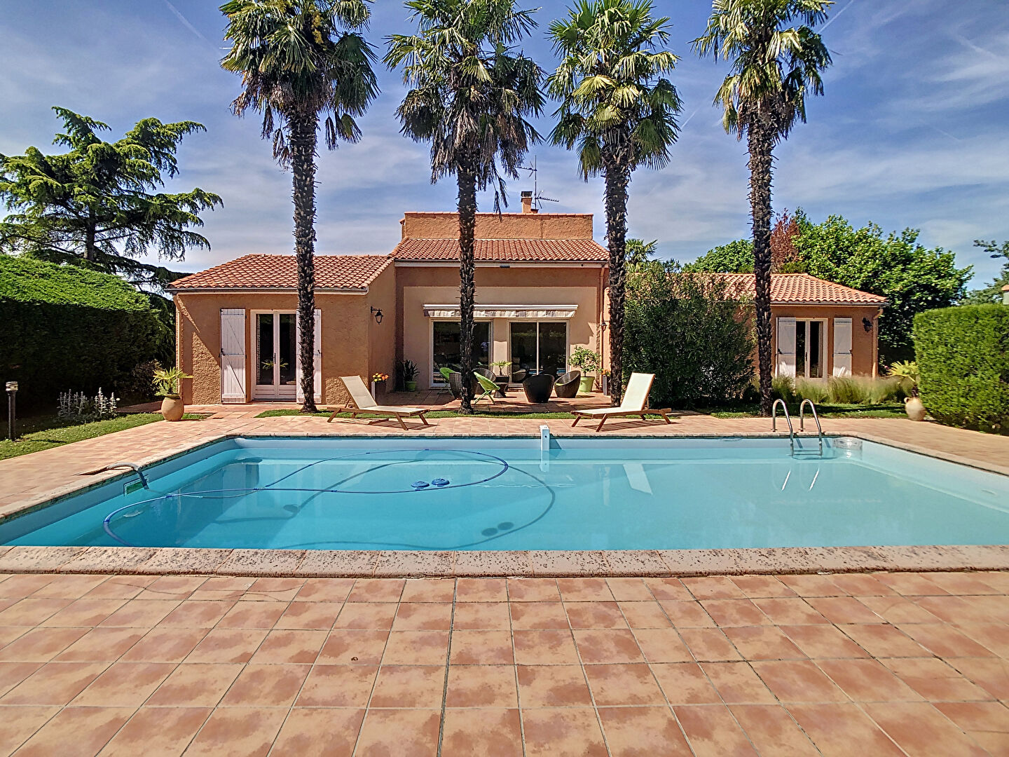 Vous allez tomber sous le charme des espaces extérieurs paysagés offrant un cadre de vie et un environnement des plus agréable avec ses 2 terrasses, la Piscine 10 x 5 exposée Sud-Ouest et son Pool House pour profiter des beaux jours en famille ou entre amis.