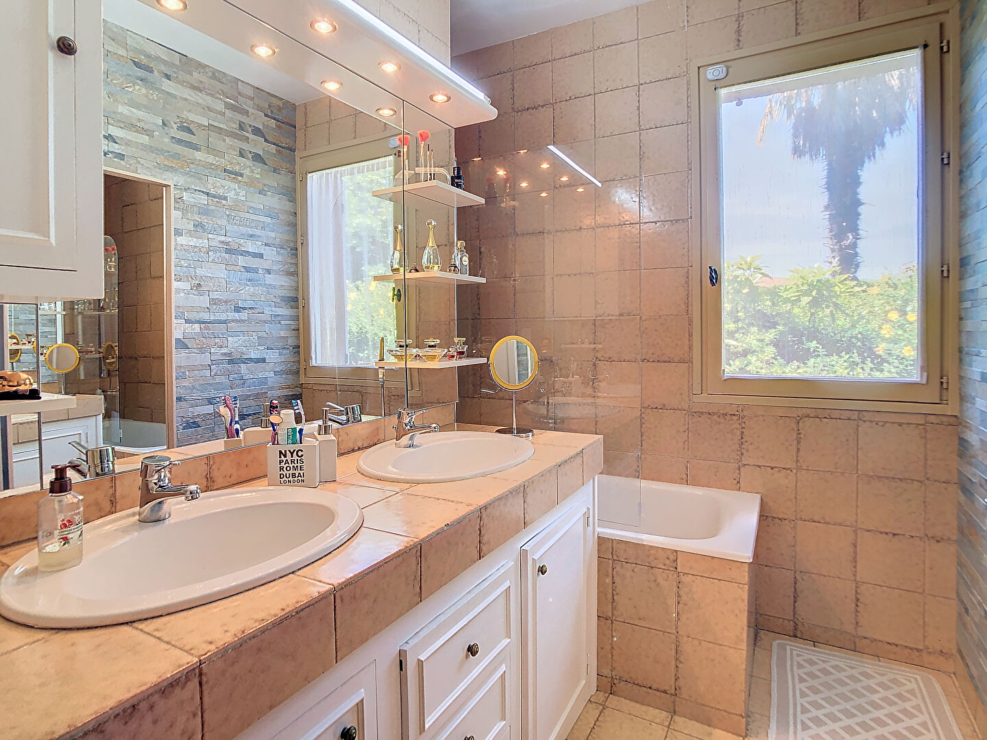 Elle se compose d'un hall d'entrée donnant sur un double séjour lumineux avec hauteur cathédrale, sa cheminée centrale à foyer ouvert et une rochelle baignée de lumière, le tout climatisé offrant un espace de vie cumulé de plus de 70 m². Une belle cuisine dinatoire indépendante aménagée et équipée.