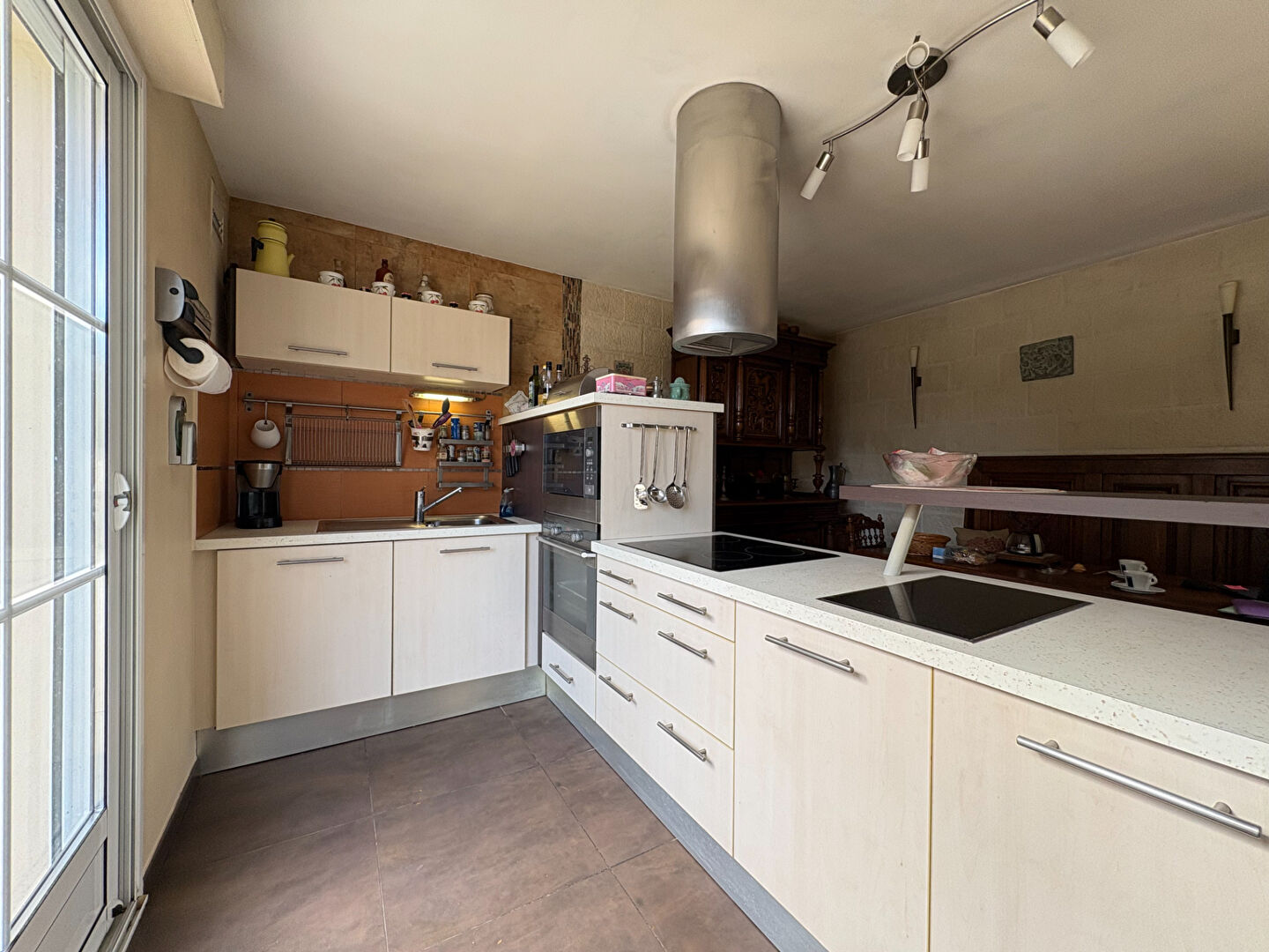 D'une part, l'entrée s'ouvre sur un joli salon cocooning avec son insert au bois ainsi qu'une belle cuisine toute aménagée et équipée avec un espace salle à manger.