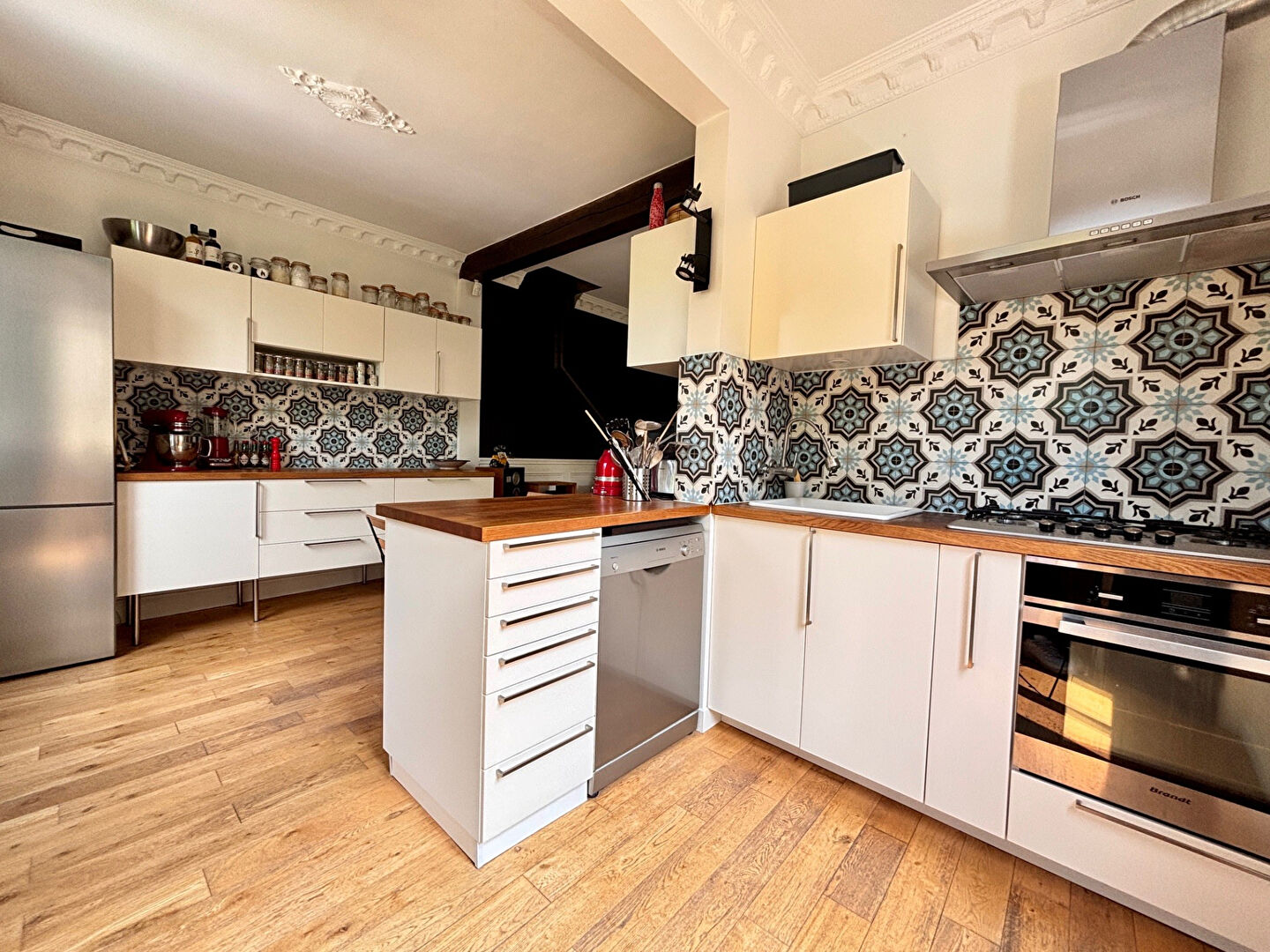 Double séjour lumineux avec parquet ancien et cuisine ouverte, fonctionnelle et contemporaine, trois chambres avec belle hauteur sous plafond et un bureau. Charme de l'ancien préservé : parquet, moulures, hauteur sous plafond. Sous-sol total avec atelier et stockage.