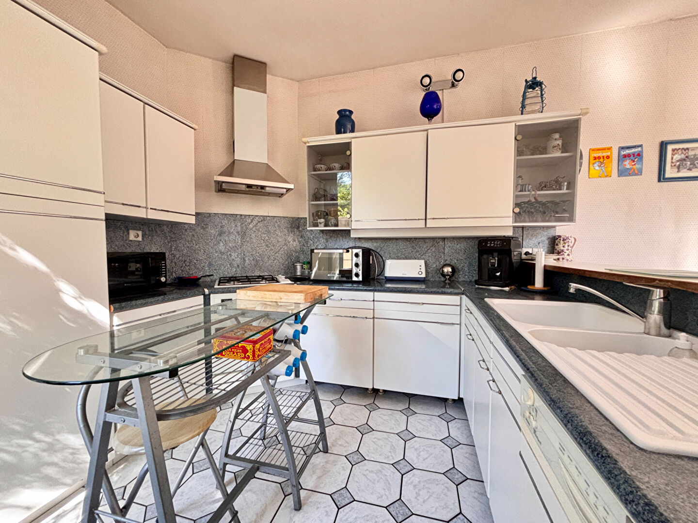 Double séjour avec cuisine ouverte en longueur, idéal pour les repas en famille ou entre amis.