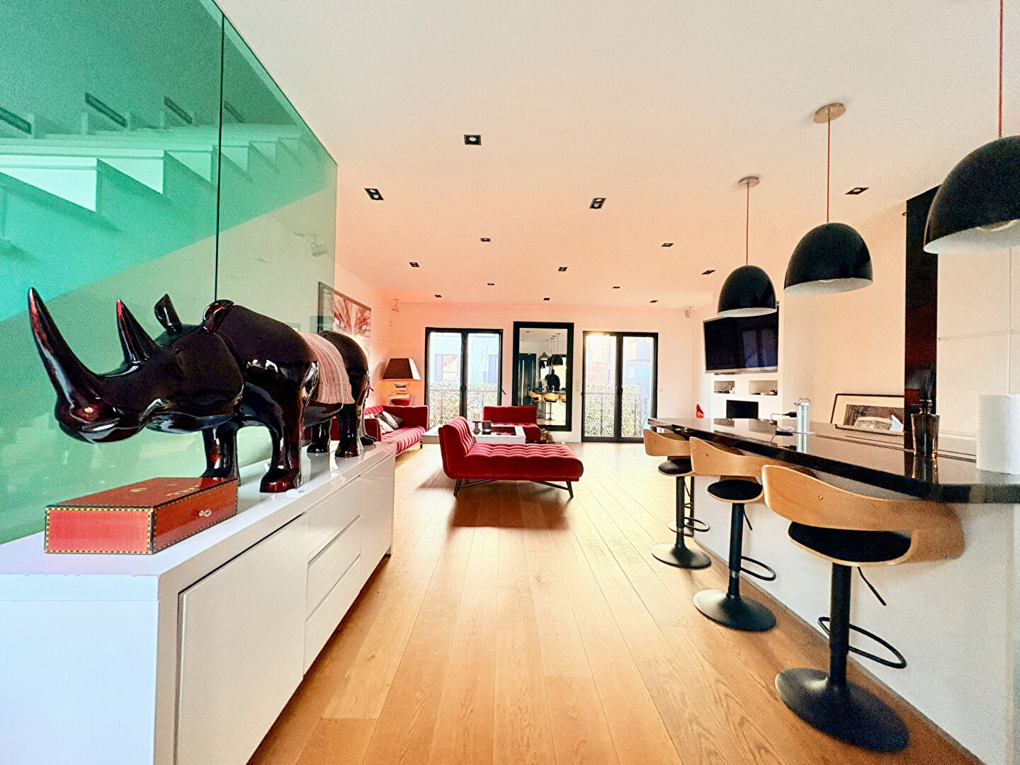 Au 1er niveau: un vaste séjour traversant, une cuisine ouverte haut de gamme, aménagée et équipée avec ilot central et placard intégré.