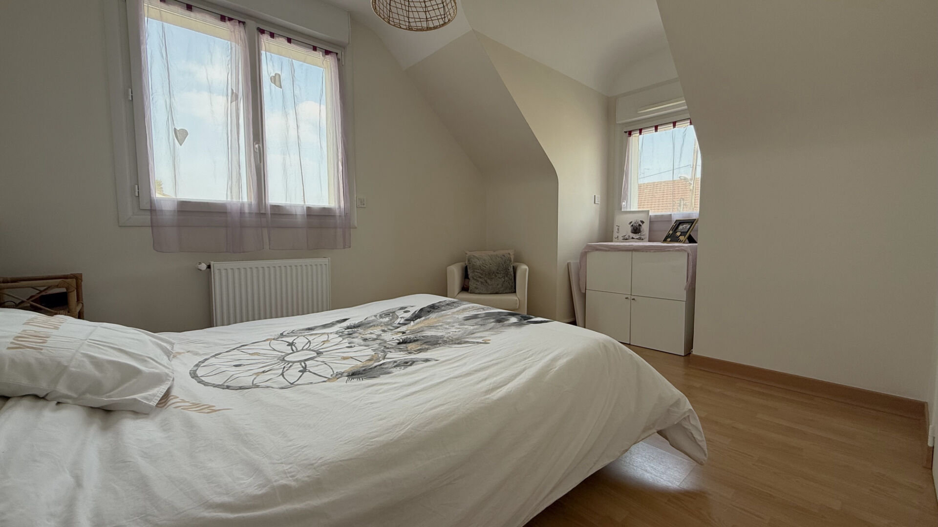 À l'étage, l'espace nuit se compose de quatre chambres lumineuses, d'une mezzanine idéale pour un bureau ou un espace détente, ainsi que d'une salle de bains et de WC indépendants.