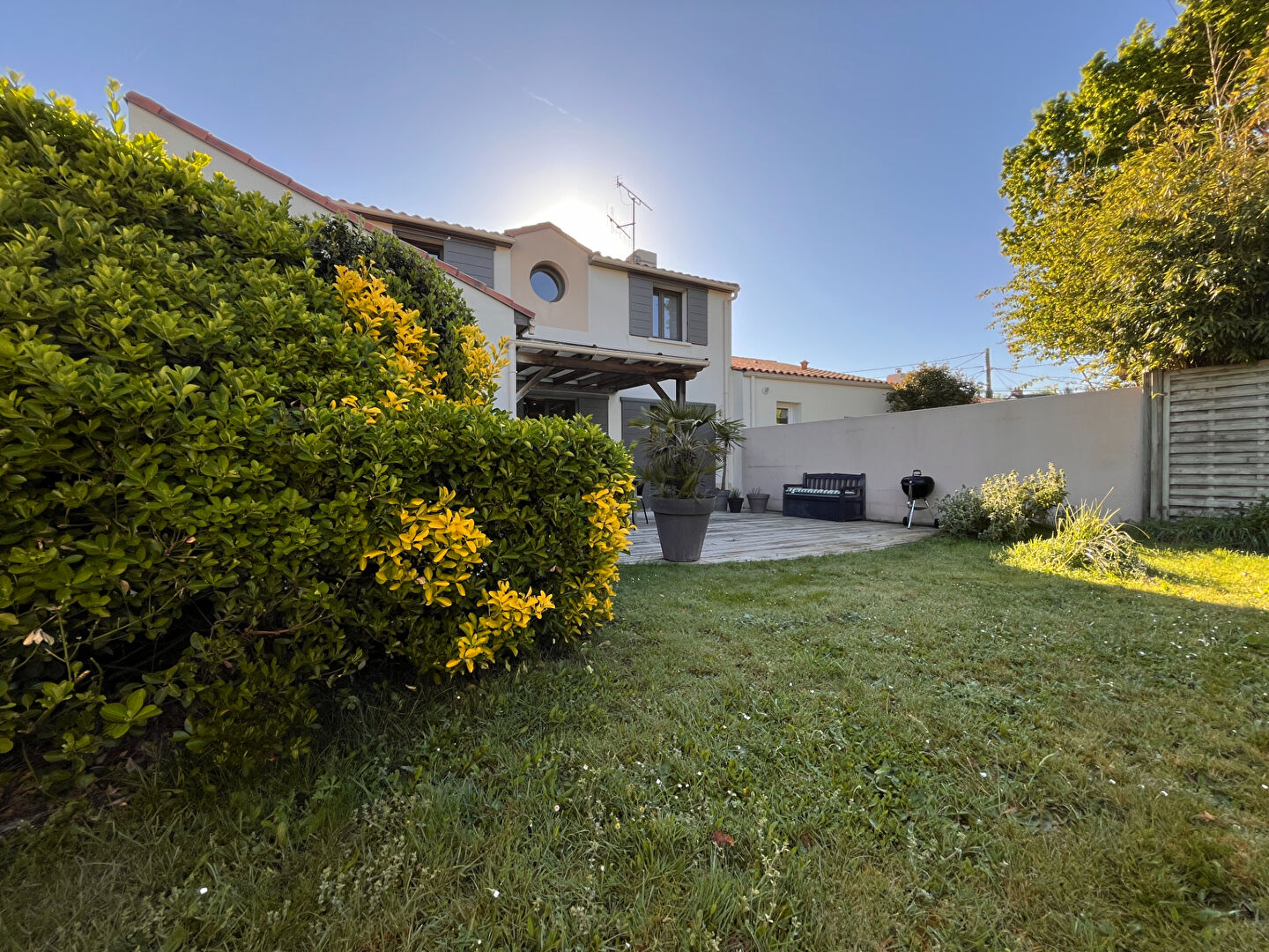 cet espace se prolonge naturellement vers une agréable terrasse et un grand jardin , arboré et sans vis-à-vis, véritable havre de paix propice à la détente.