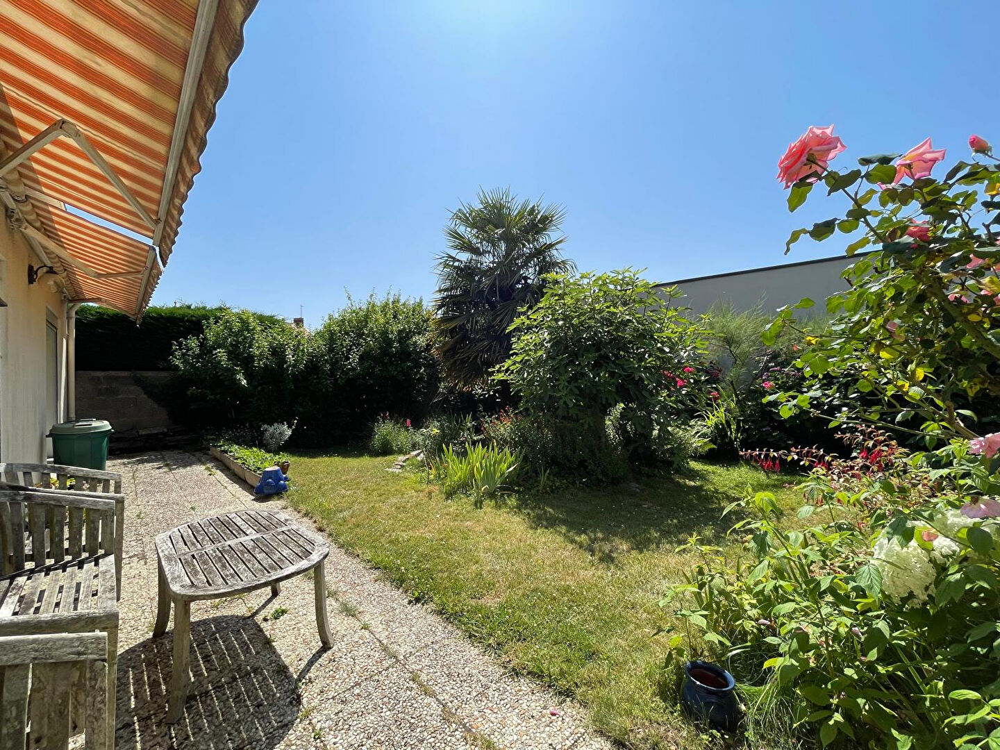 À l'extérieur : cour fermée à l'avant, place de stationnement privative et jardin exposé plein sud sur l'arrière, clos de murs, sans vis-à-vis et très arboré.