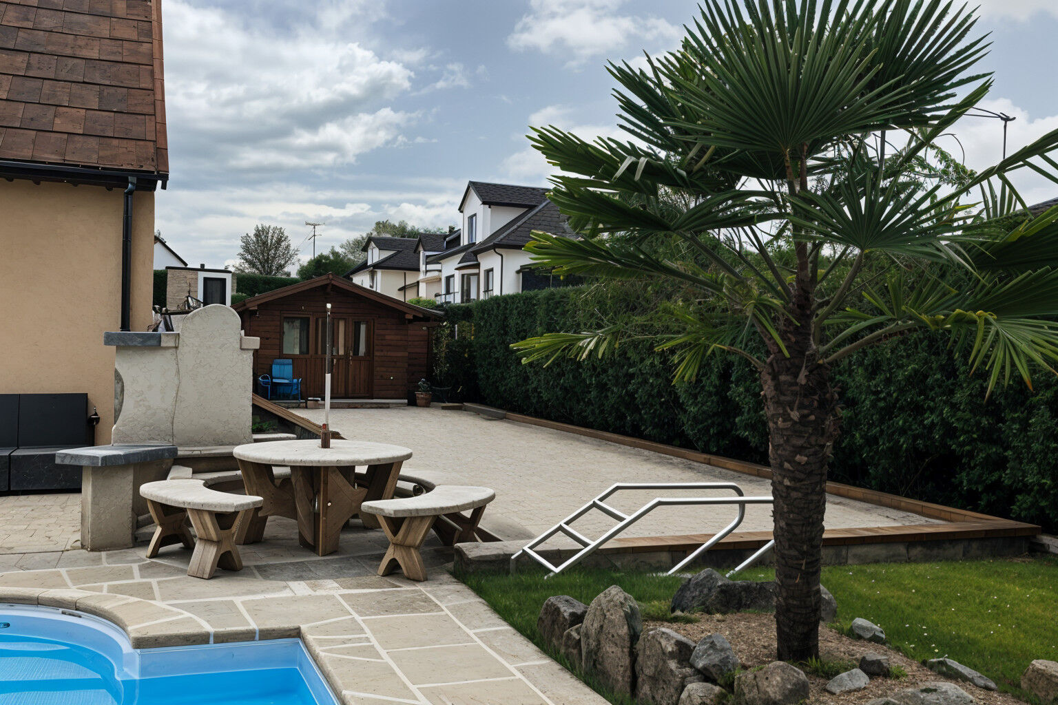 L'extérieur, particulièrement soigné, offre un jardin spacieux, une piscine enterrée, un terrain de pétanque et des espaces de détente ? un cadre idéal pour la vie de famille et les réceptions estivales.