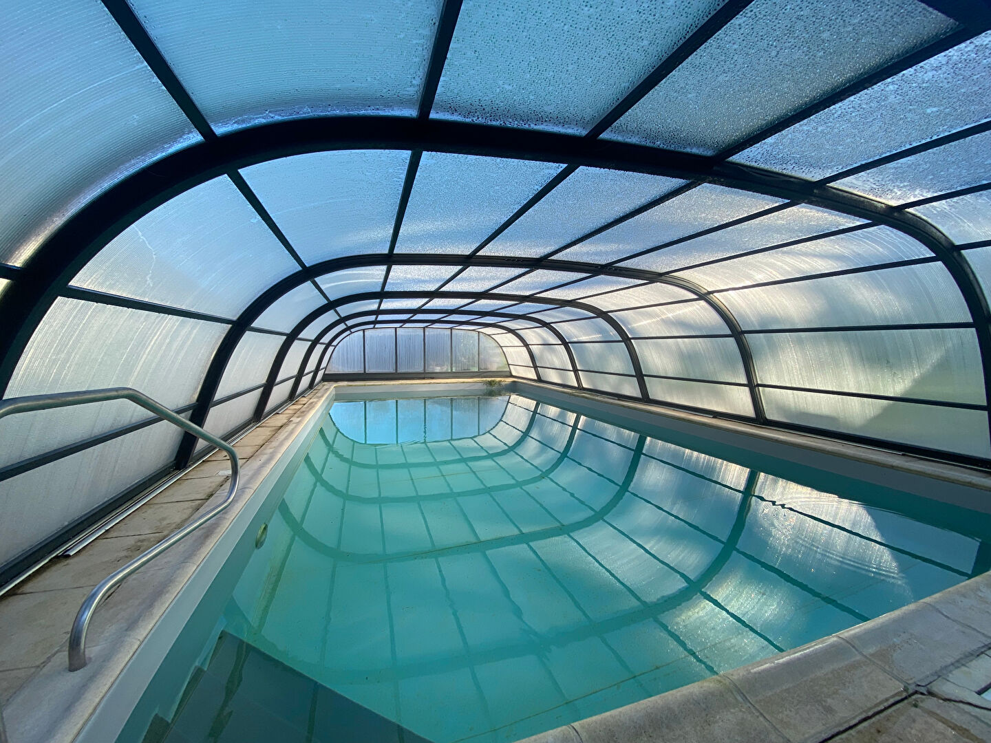 A l'extérieur, un terrain de 1 844 m2 sans vis à vis, agrémenté d'un jardin, d'un terrain de boules et d'une piscine couverte chauffée pour partager des moments conviviaux en famille ou entre amis.