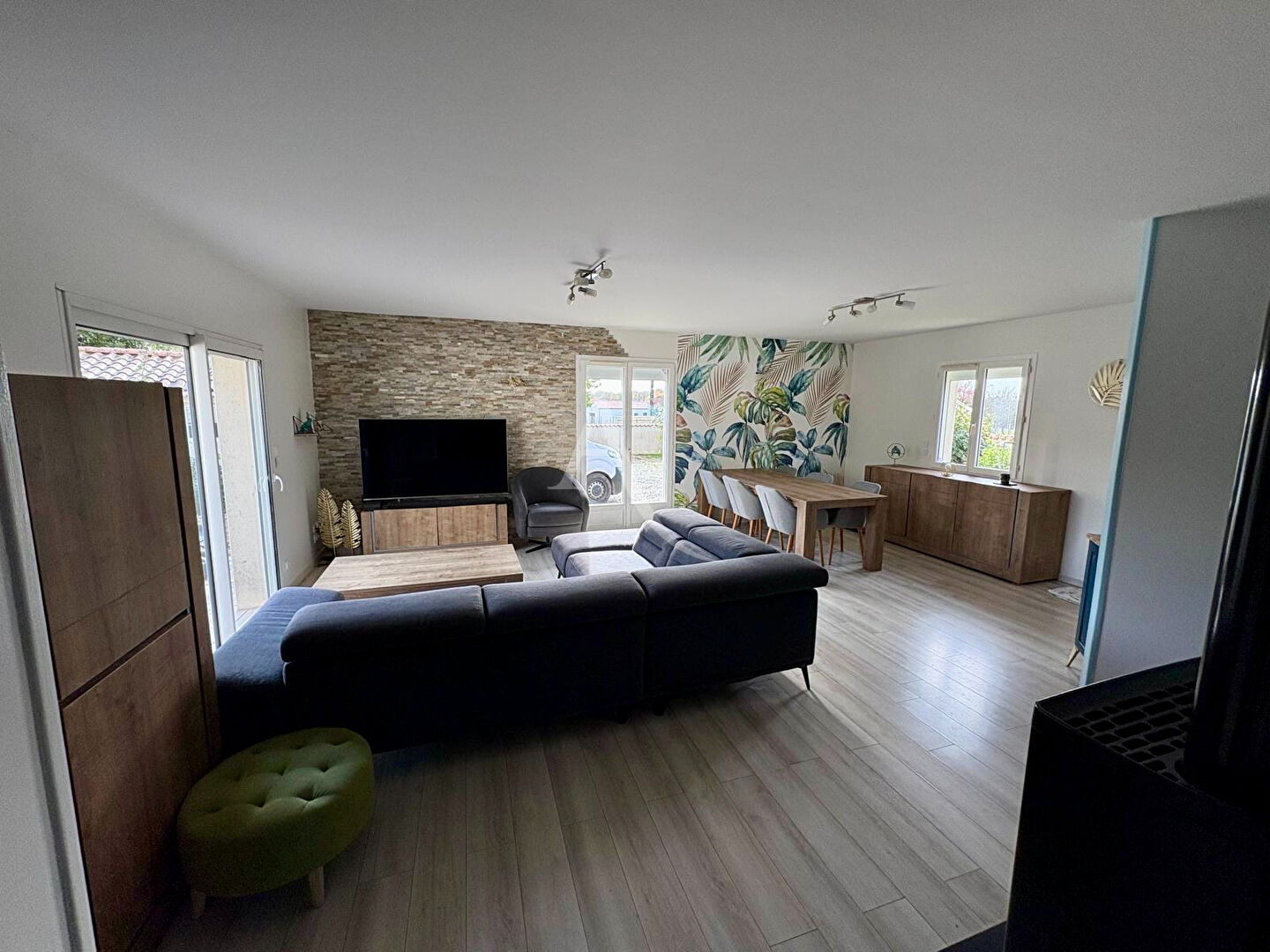 Elle comprend un spacieux séjour-salon de 35m², agrémenté d'un poêle à granulés pour une chaleur agréable, ainsi qu'une cuisine aménagée et équipée, complétée par un cellier.