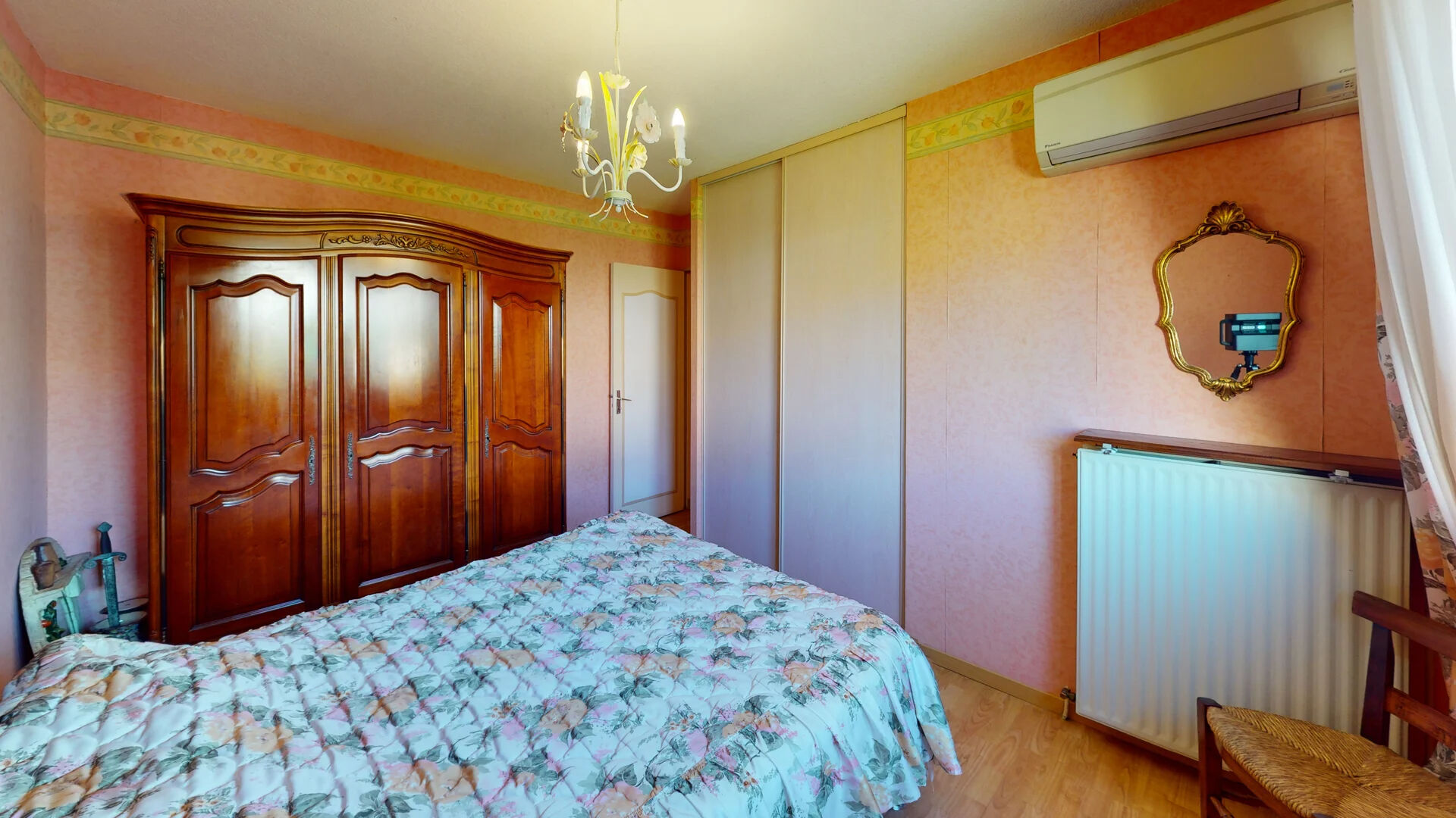 Maison climatisée comprenant une entrée desservant deux chambres, un cellier, des WC et une salle de bains.