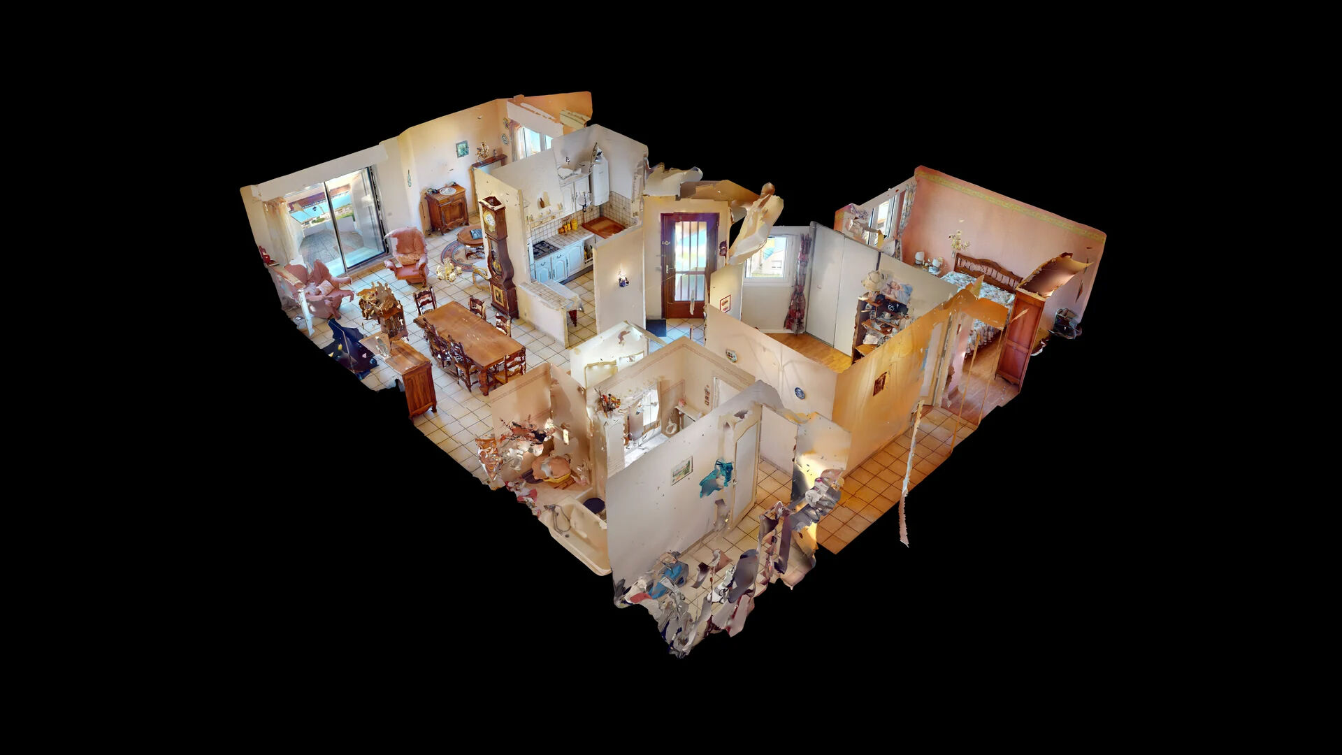 Dans la partie vie, une grande pièce constituée d'une partie salle à manger faisant face à la cuisine aménagée équipée ouverte et d'une autre partie salon donnant sur une terrasse.