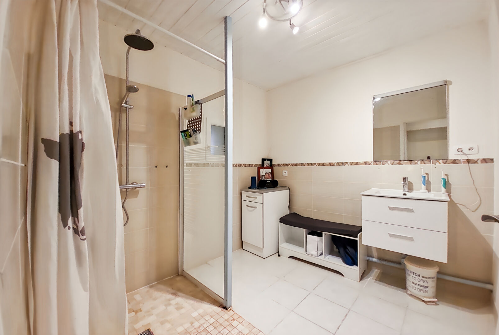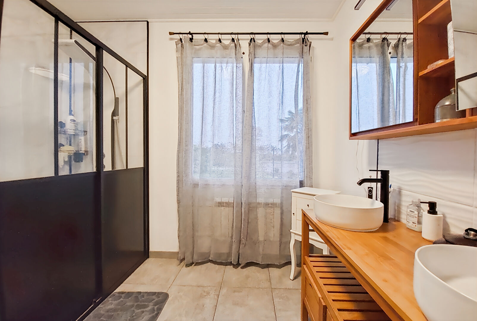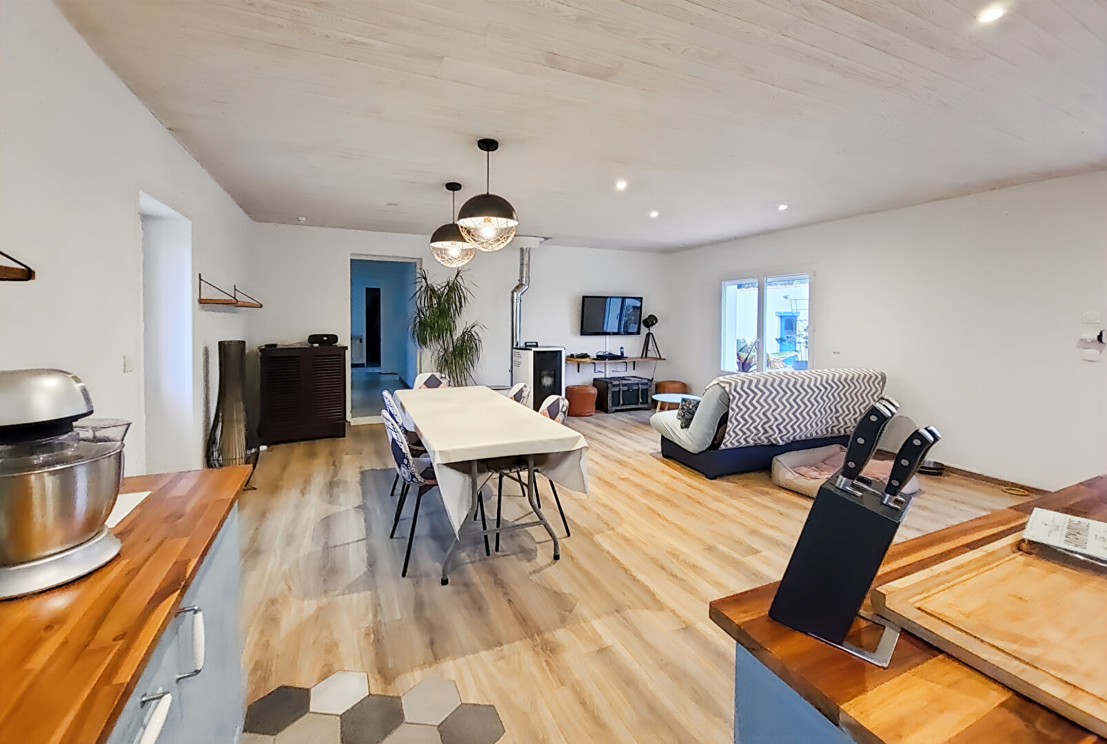 À droite, vous découvrirez une grande pièce de vie avec cuisine américaine et arrière-cuisine, un couloir vous mène vers un deuxième espace nuit avec deux chambres, salle d'eau, WC et buanderie.