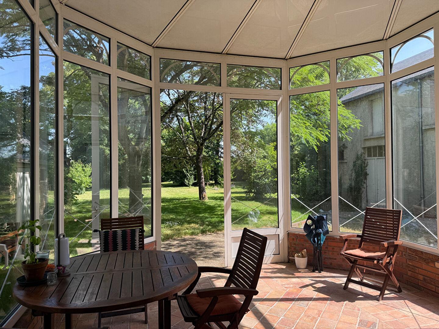 La véranda, donnant sur le jardin clos de murs, invite à la détente en toute intimité.