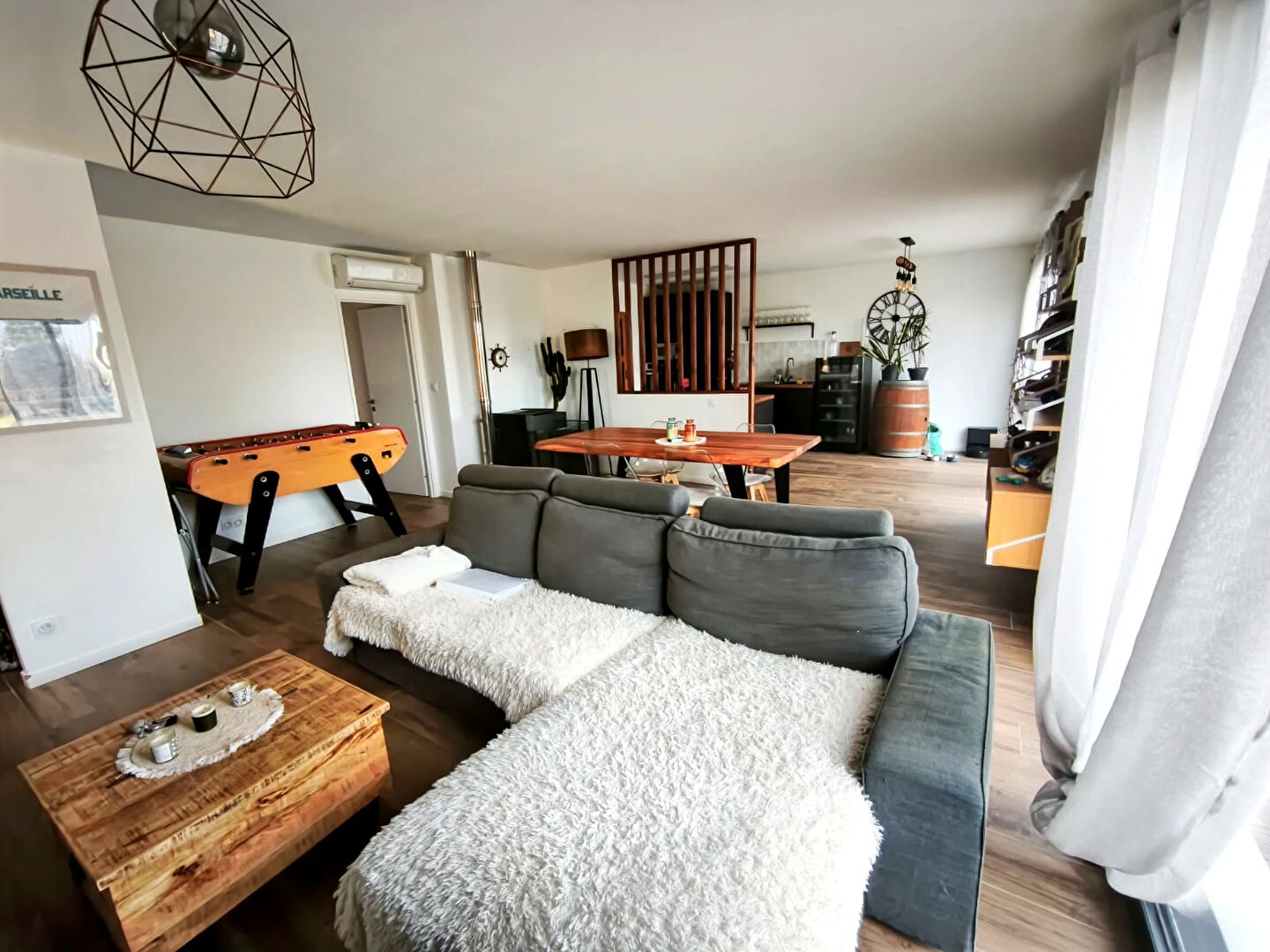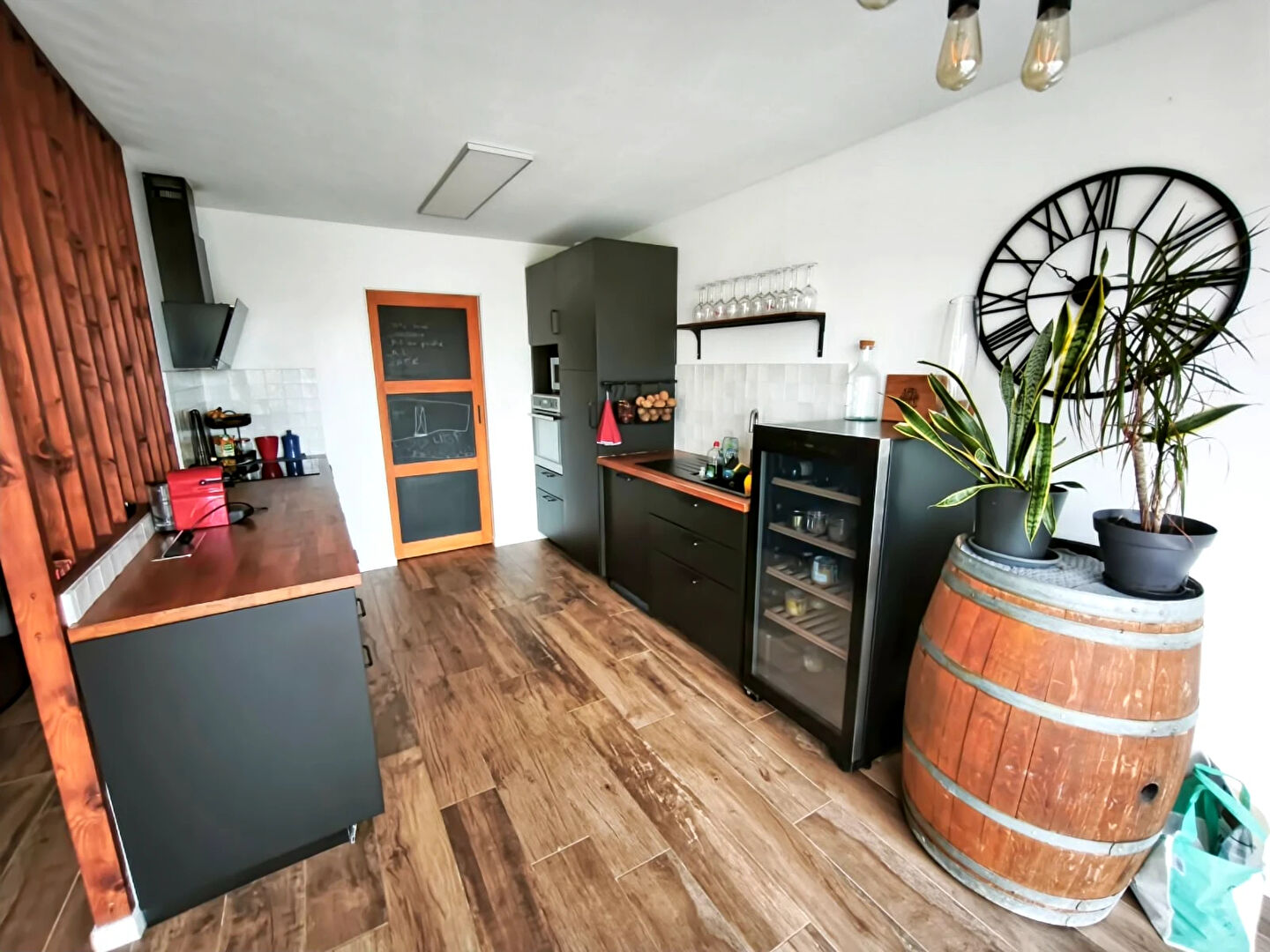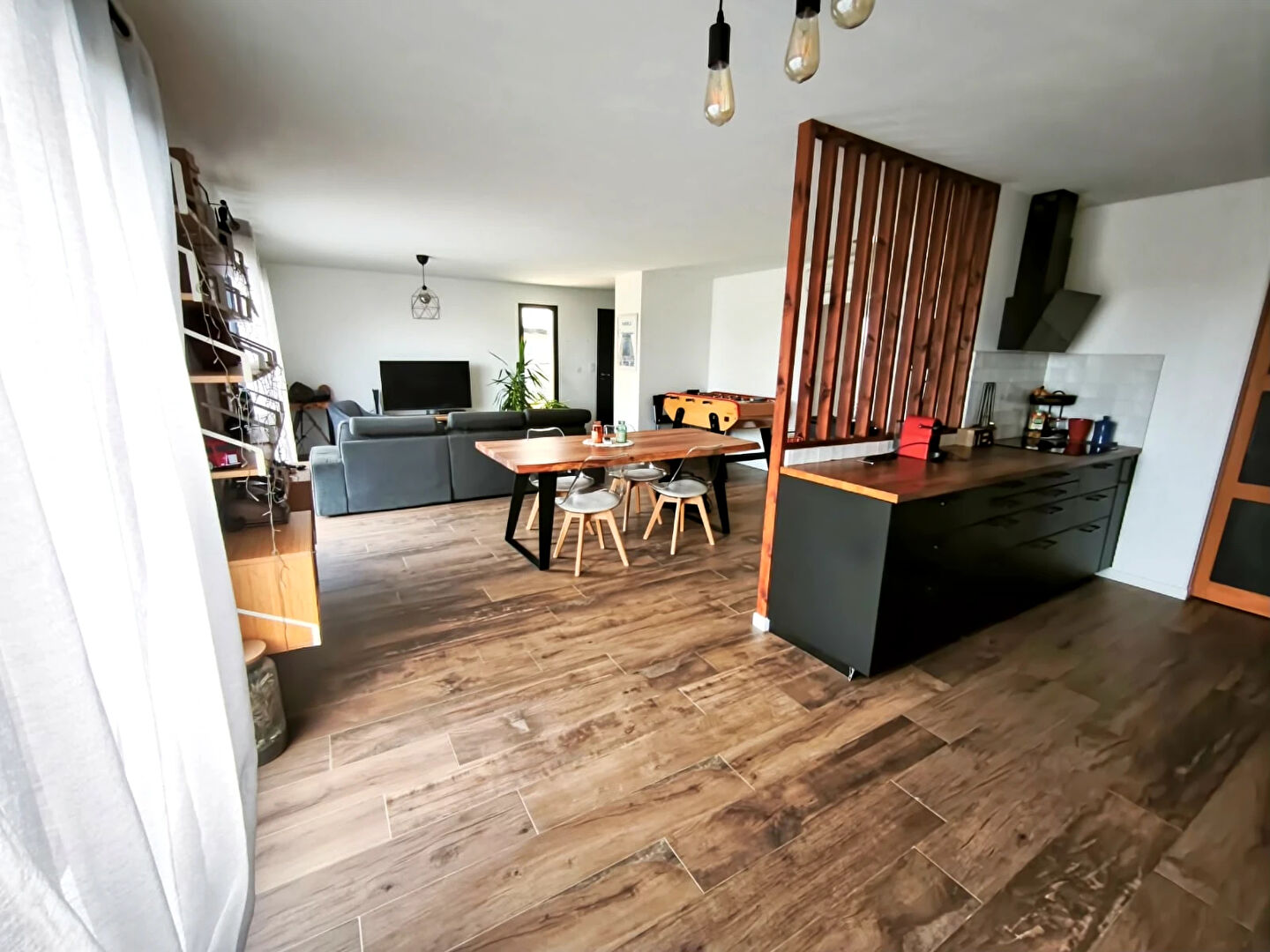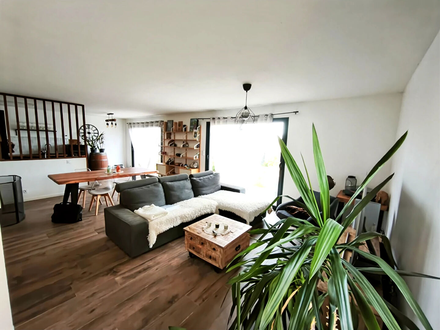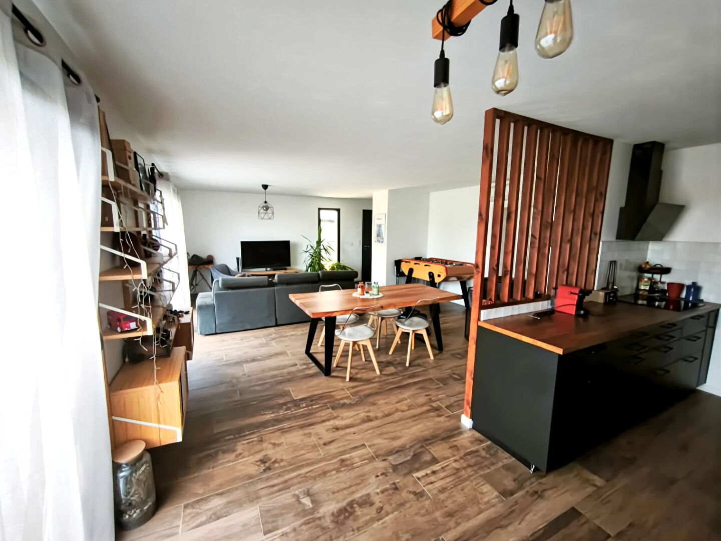 La pièce de vie de 48 m² est très agréable, avec ses 2 grandes baies vitrées qui donnent sur l'extérieur et la grande cuisine (14 m²) ouverte équipée, avec son cellier attenant.