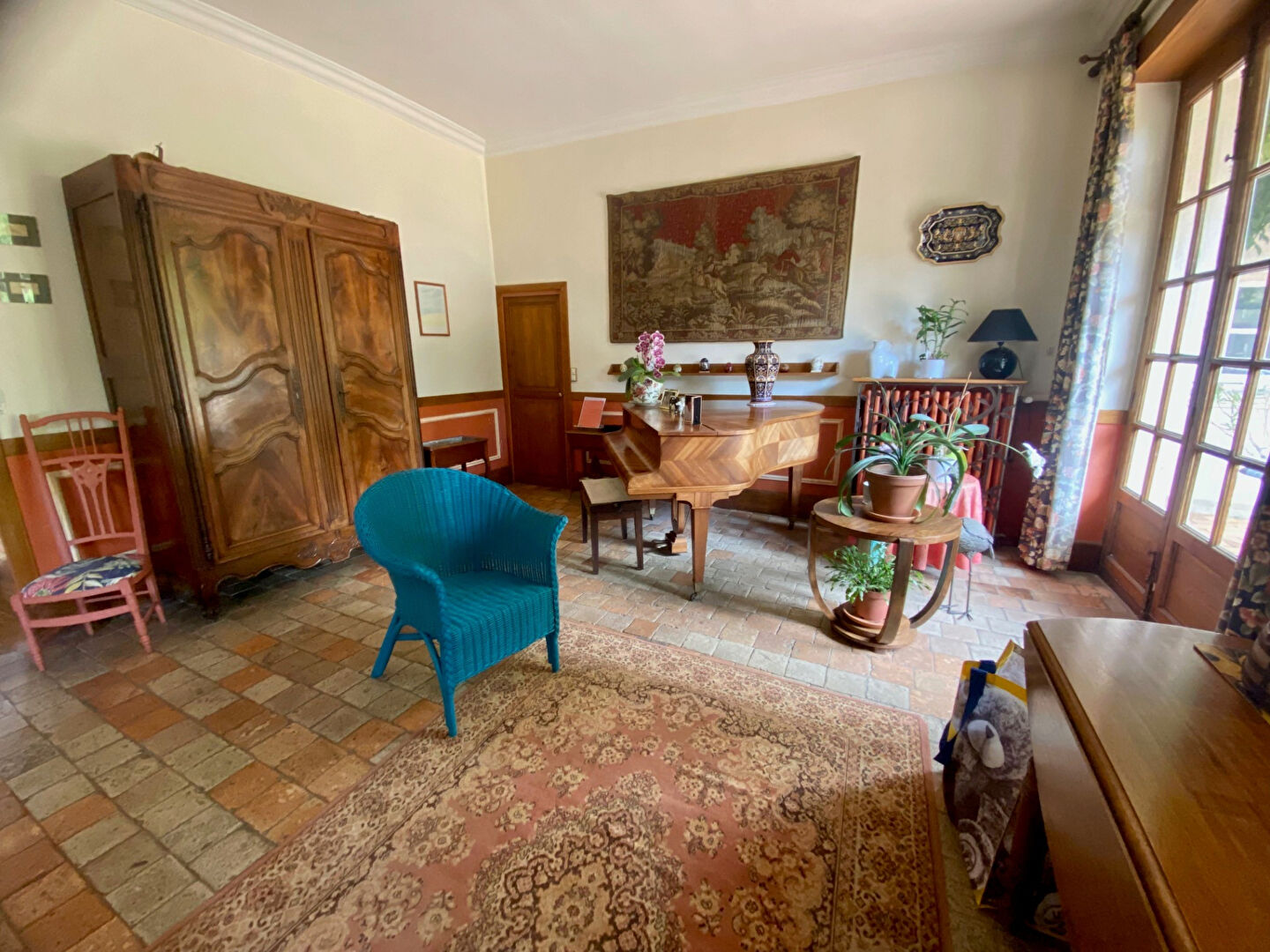 - au RdC : une entrée, un vaste séjour (cheminée, tomettes) ouvert sur une terrasse au calme et sans vis à vis, une salle à manger, une grande cuisine dinatoire, une chambre, un bureau,