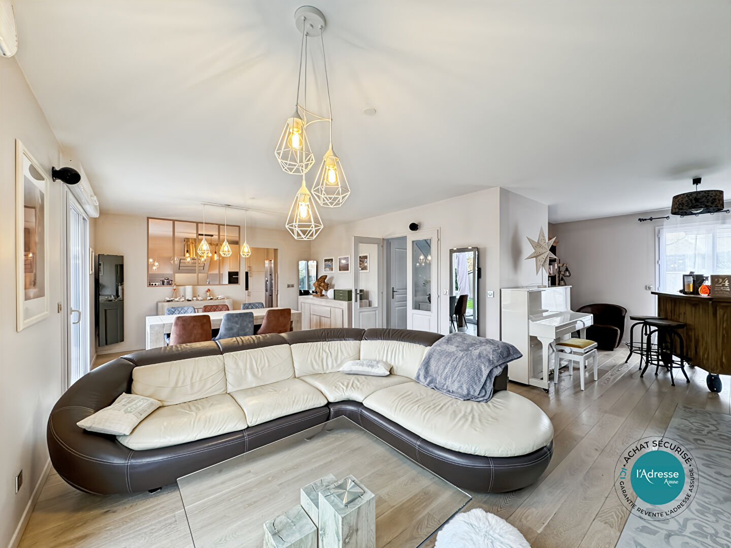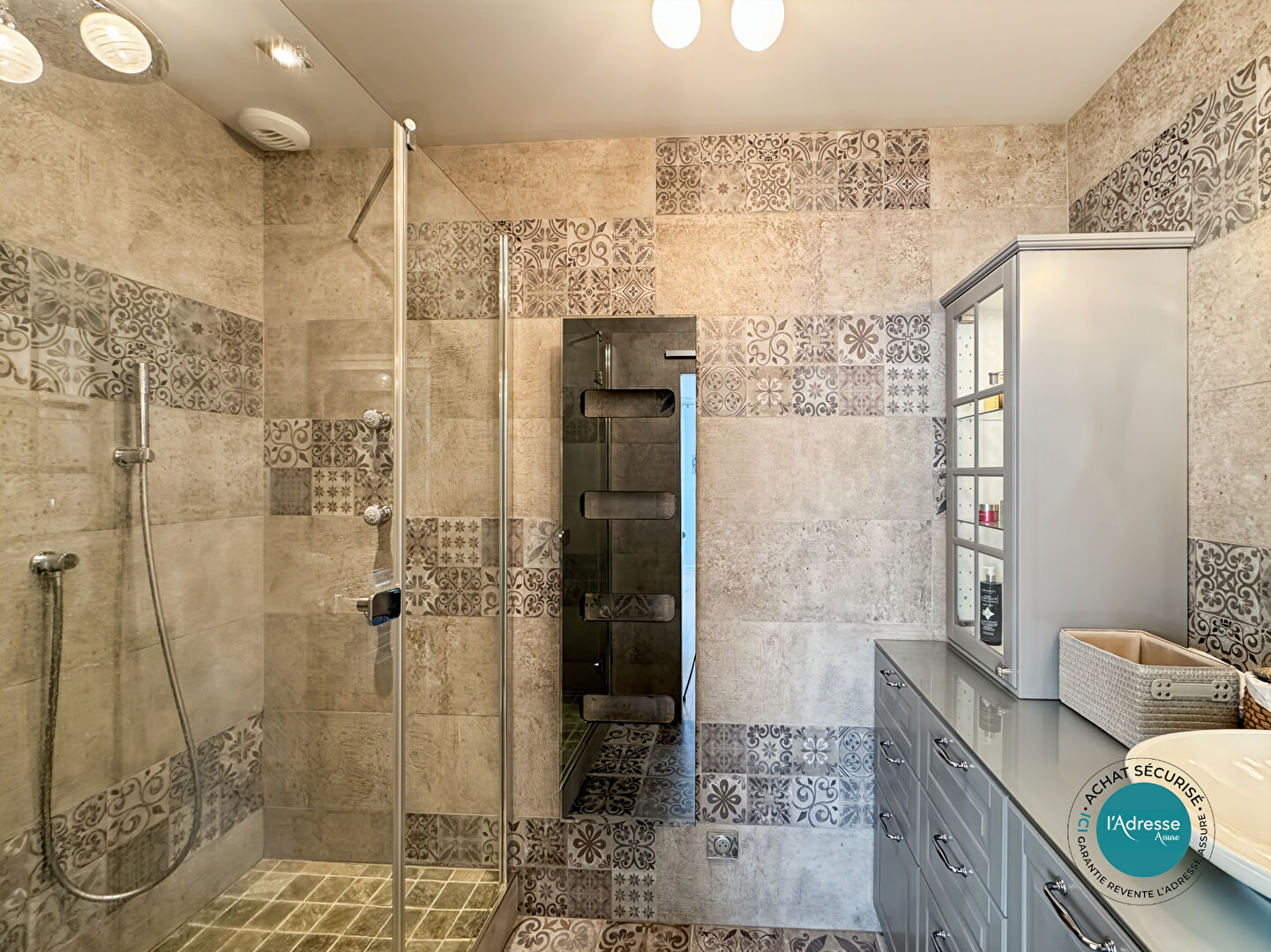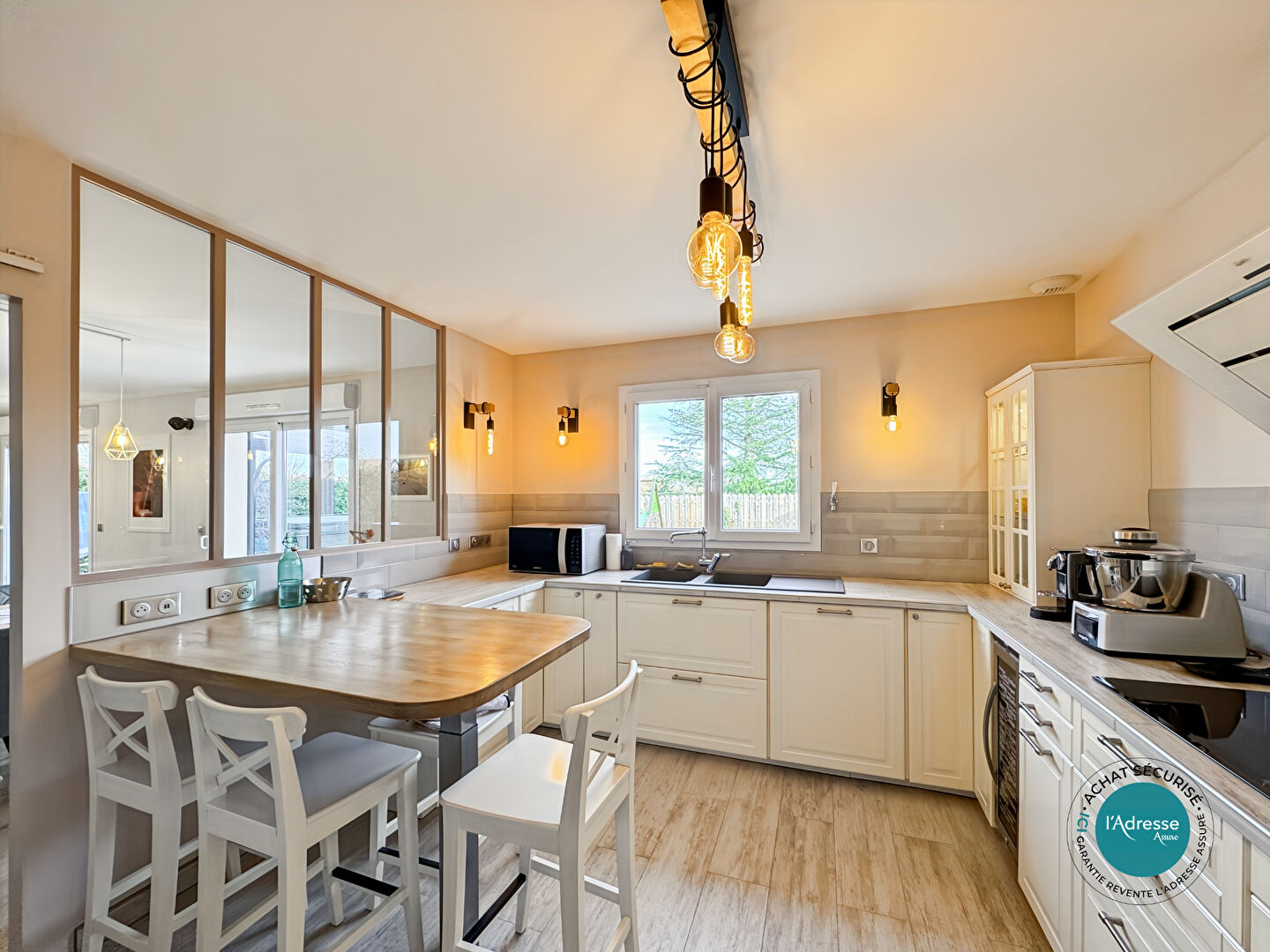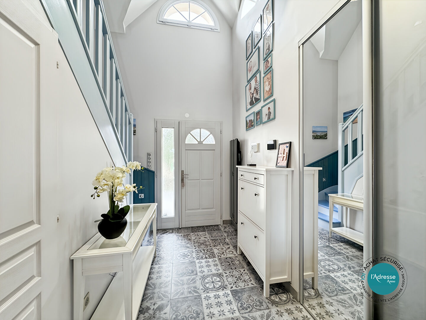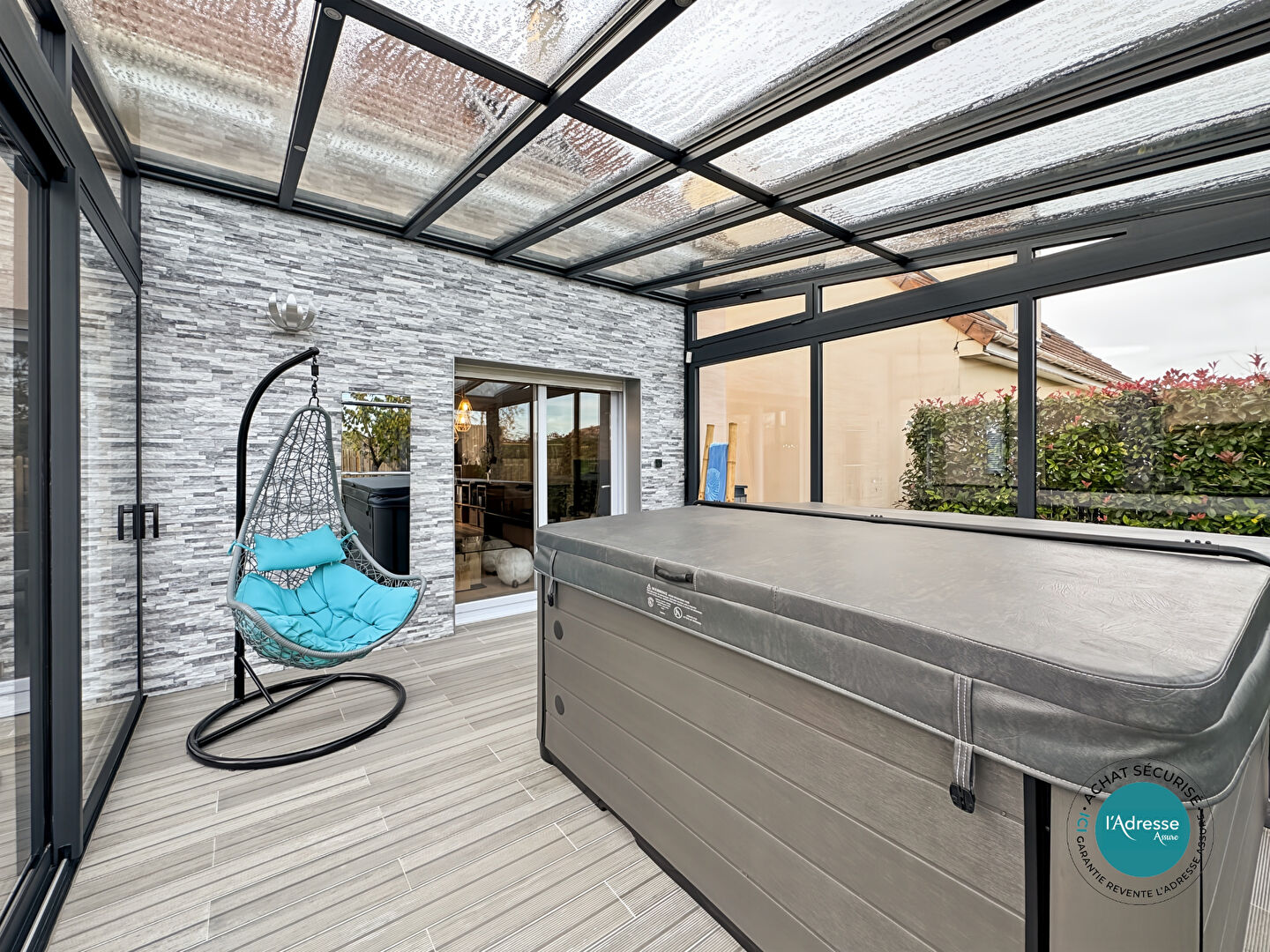 Entrée cathédrale avec placards intégrés, WC avec lave-mains, un séjour double traversant baigné de lumière naturelle, doté d'une cheminée, créant une atmosphère chaleureuse et conviviale, ainsi qu'une cuisine dinatoire, entièrement aménagée et équipée, et une véranda de 19m² chauffée et son spa thérapie.