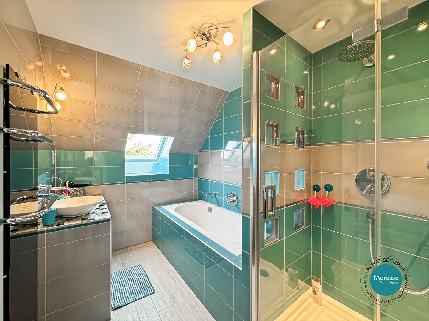 À l'étage, vous trouverez trois chambres avec placards, une salle de bains avec douche et baignoire, ainsi qu'un WC séparé. La suite parentale dispose d'un grand dressing et d'une salle d'eau privative.