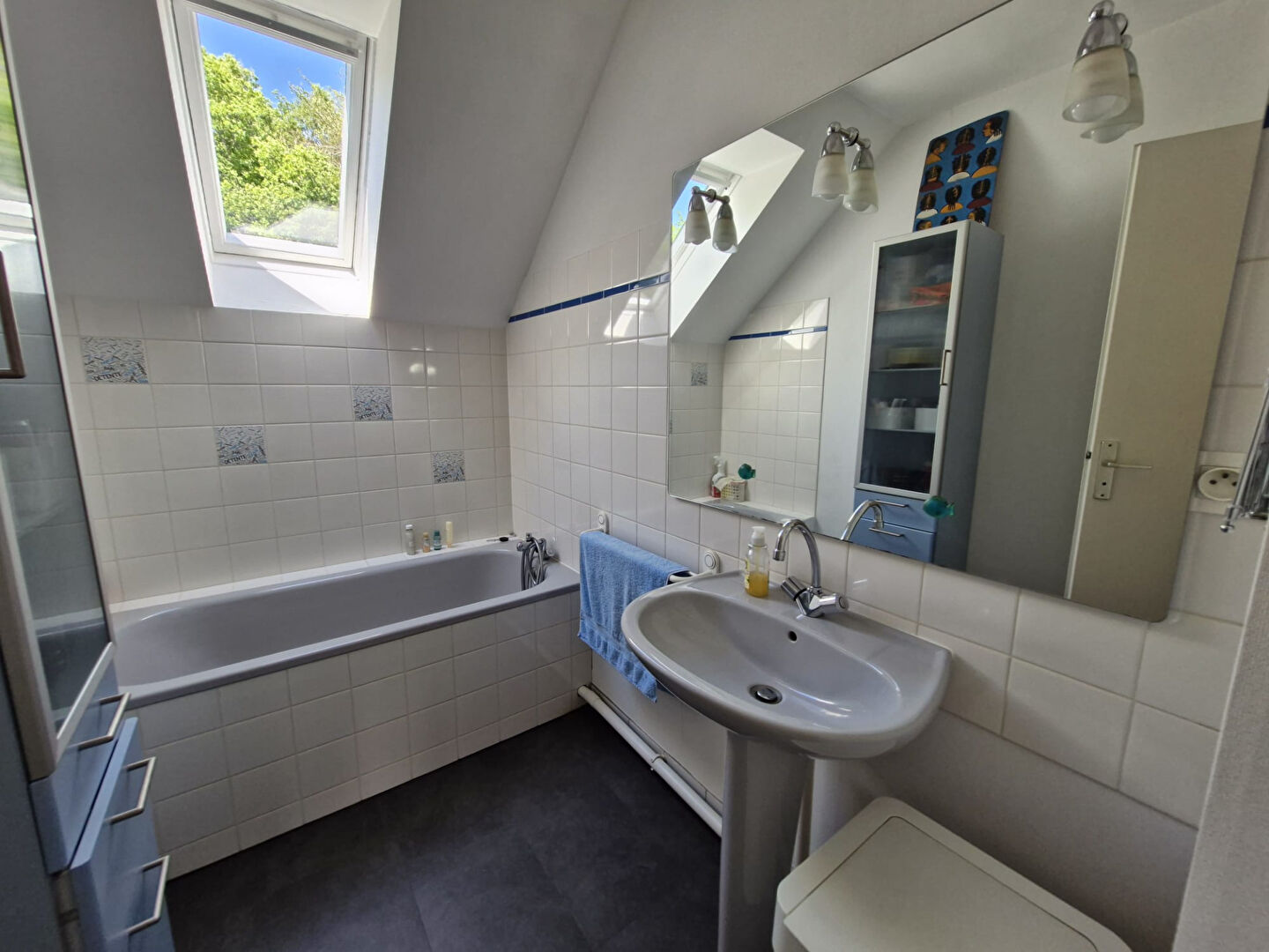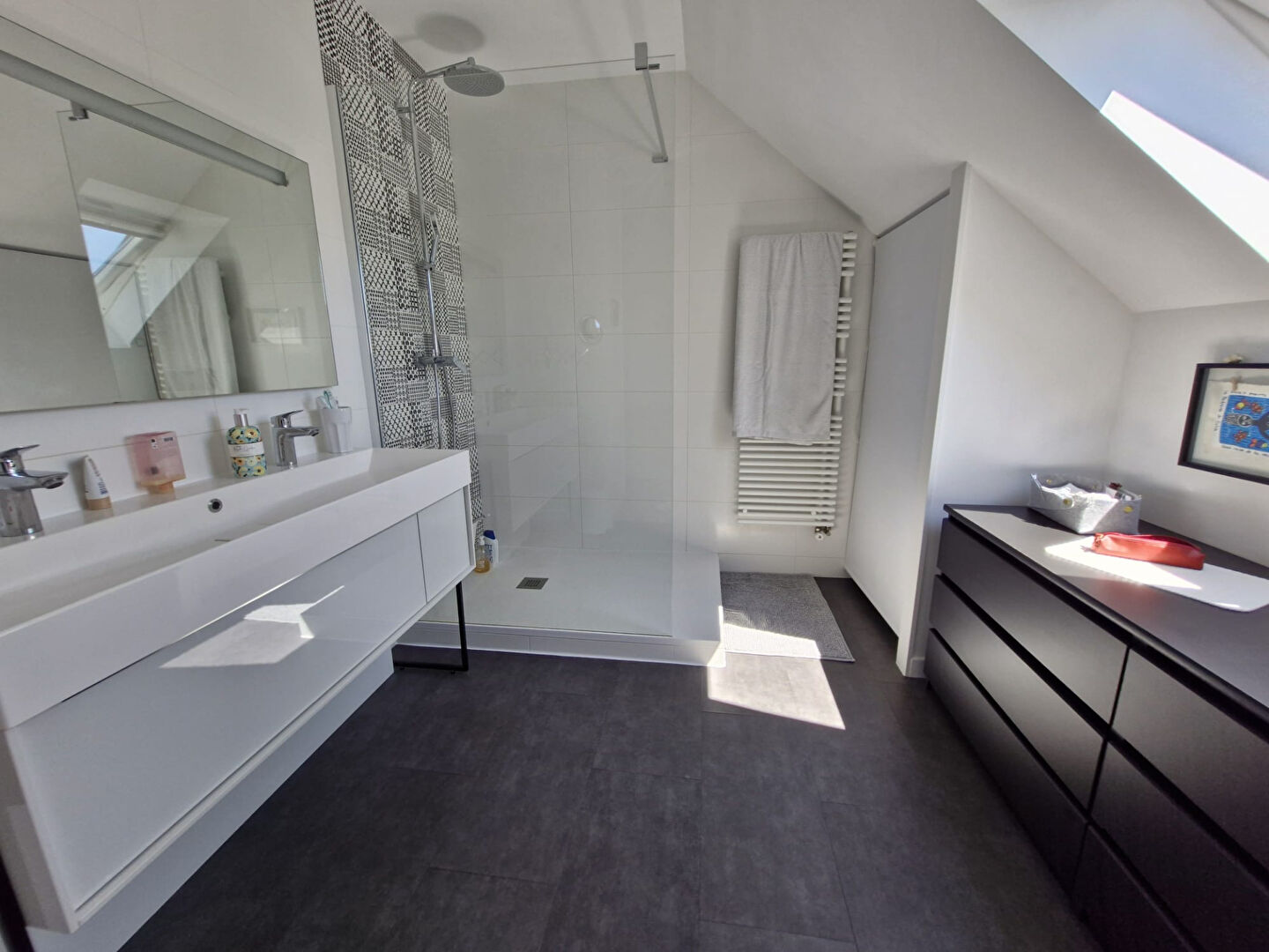 À l'étage, un palier dessert une suite parentale avec deux chambres supplémentaires, une salle de bains indépendante ainsi qu'un WC séparé, offrant tout le confort nécessaire.