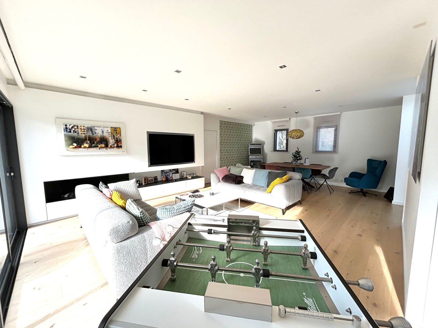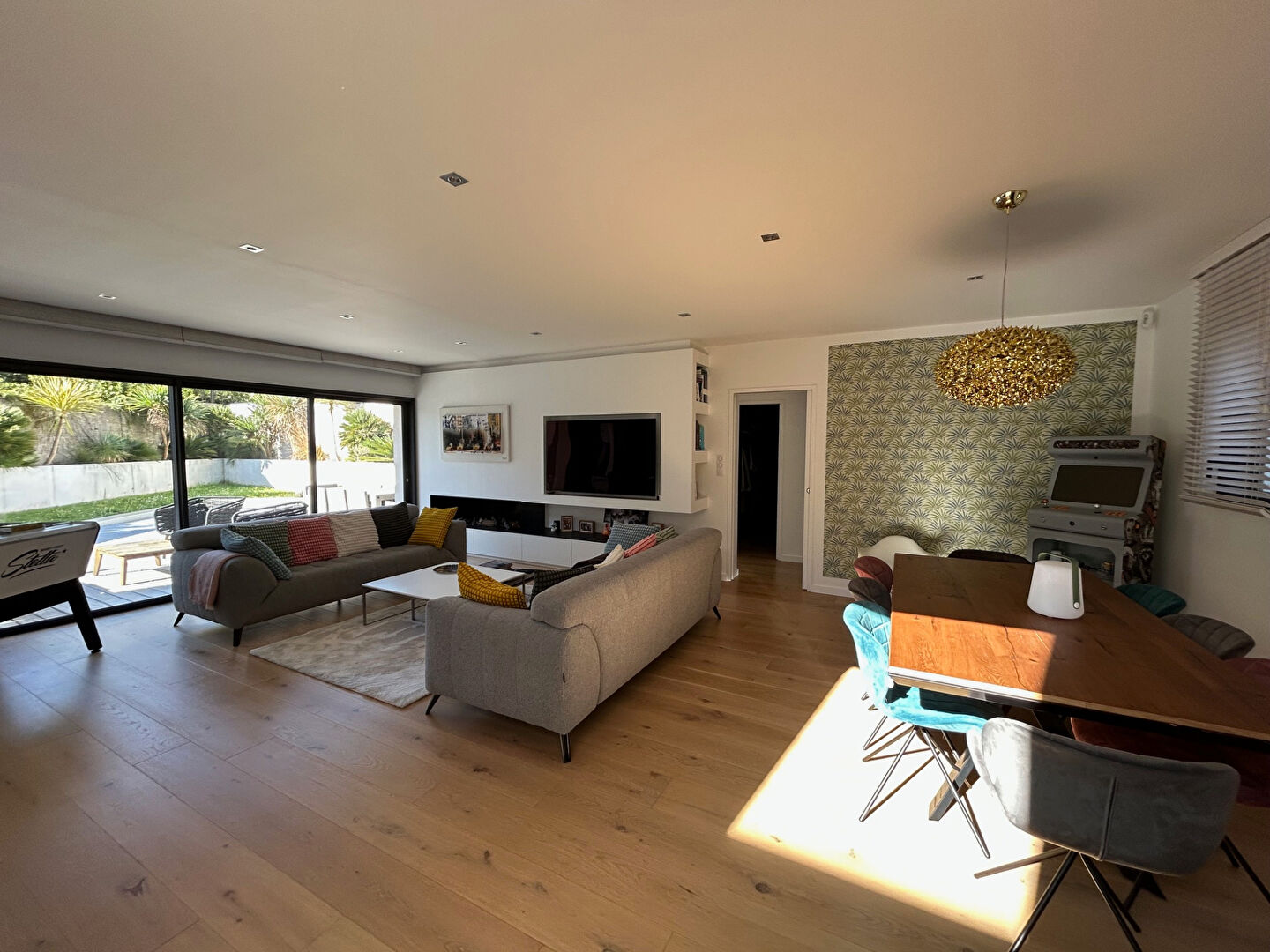 Dès l'entrée, vous découvrirez une superbe pièce de vie de 65m² baignée de lumière grâce à son exposition sud-ouest, idéale pour profiter du soleil tout au long de la journée. Les volumes généreux et les lignes épurées créent une ambiance résolument actuelle et conviviale, sublimée par une élégante cheminée au gaz, parfaite pour des moments cocooning.
