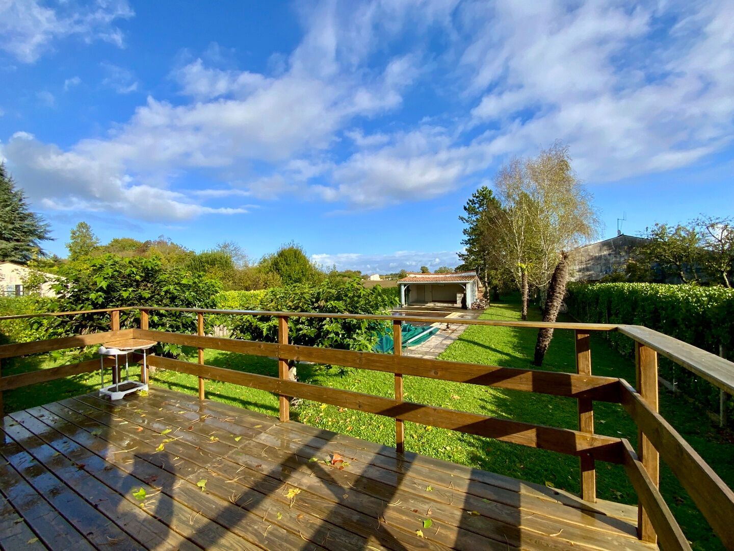 Terrasse bois surplombant un joli jardin clos avec piscine Waterair, cuisine d'été et son appentis.