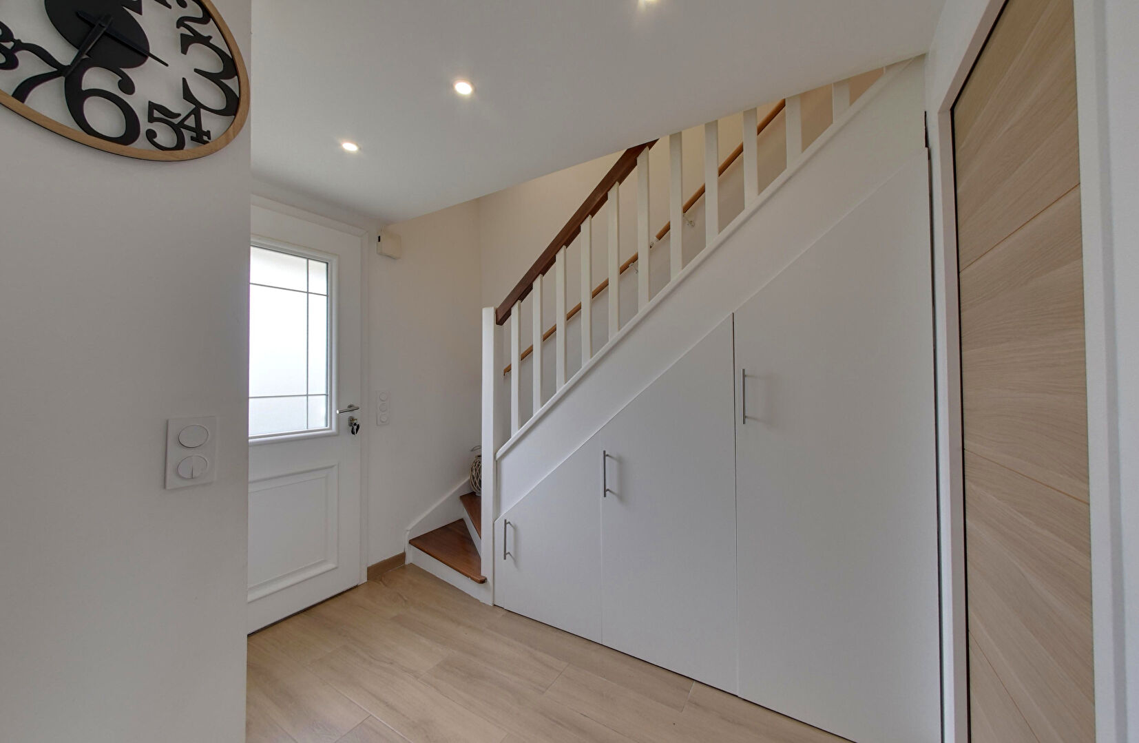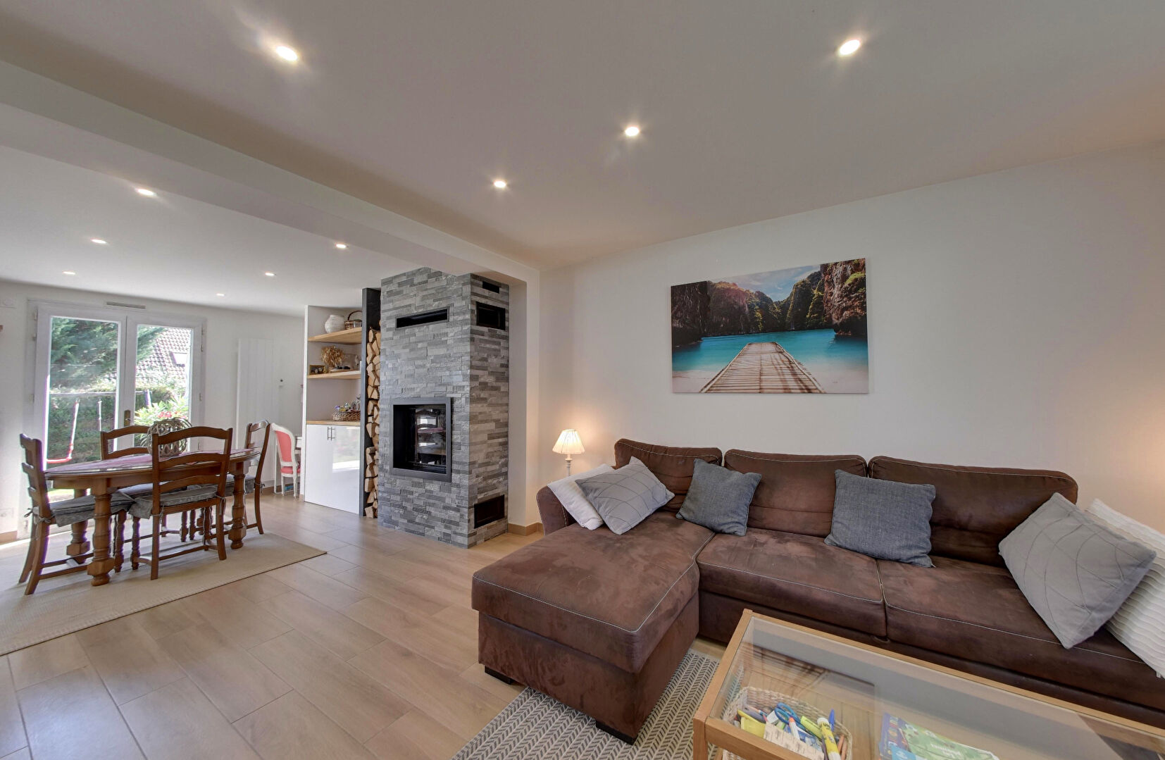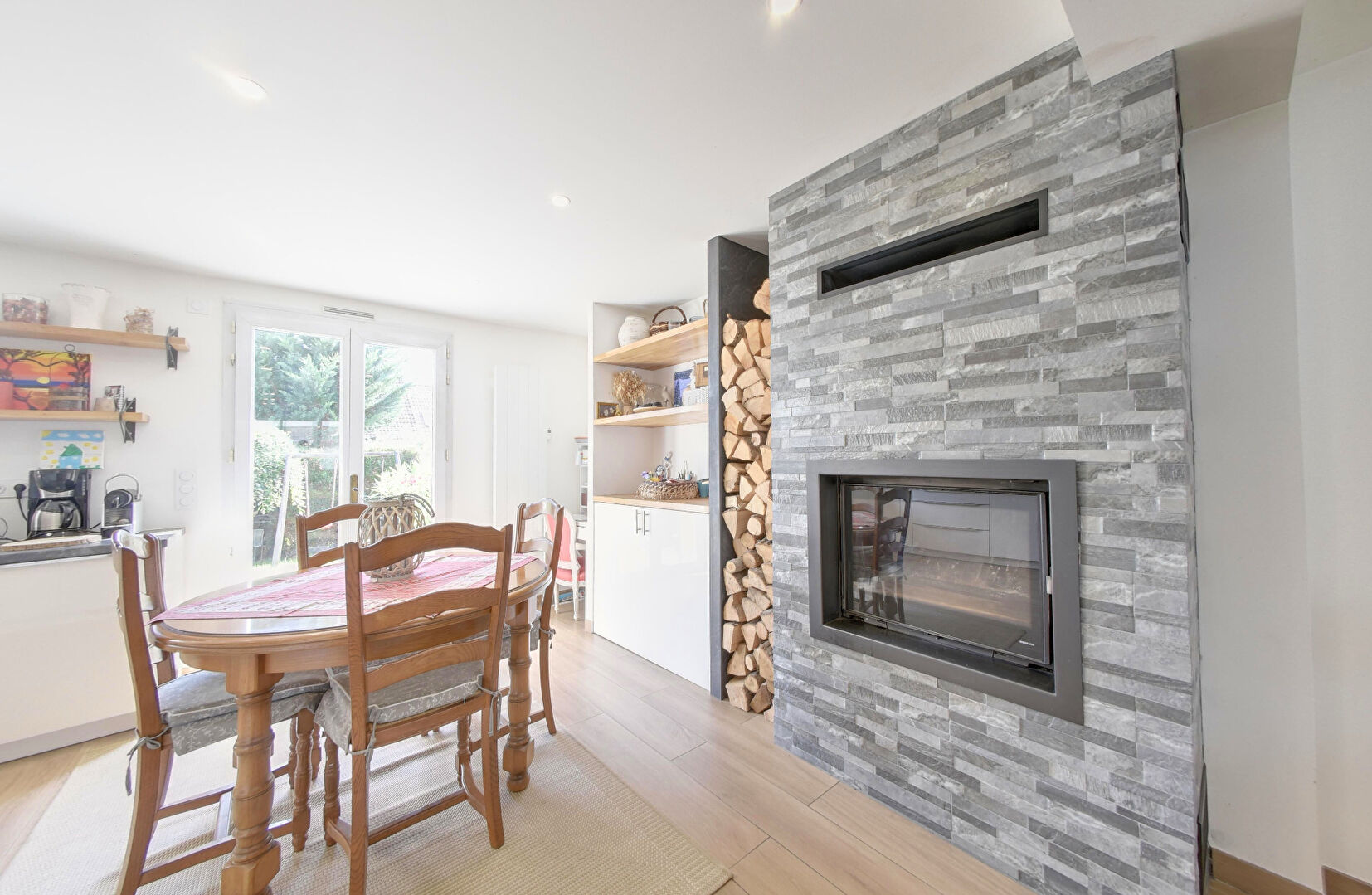 Dès l'entrée, vous serez accueilli par un vaste hall avec rangements, ouvrant sur une belle pièce de vie de plus de 35 m². Celle-ci comprend un séjour-salon chaleureux avec cheminée insert ( range bûches & buffet intégré ), ainsi qu'une cuisine équipée moderne et parfaitement fonctionnelle. En complément : un WC suspendu avec lave-mains, une buanderie, abri bois et un garage.