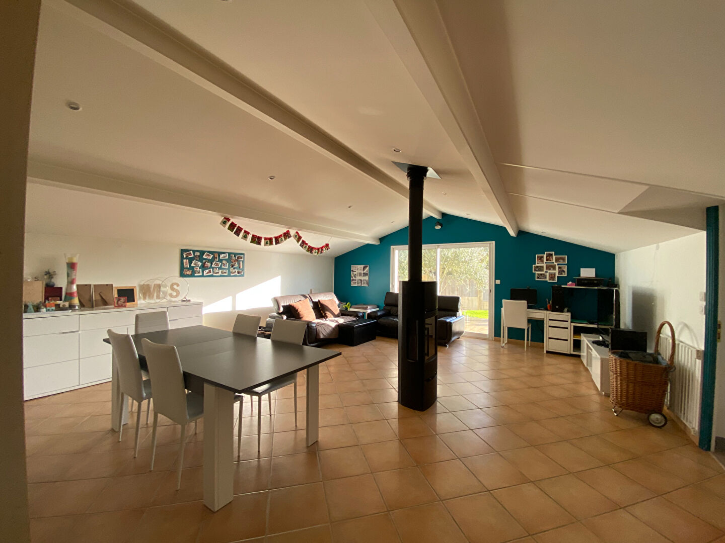 Elle offre une belle pièce de vie conviviale composée d'un salon et d'une salle à manger avec poêle à bois, ainsi qu'une cuisine moderne aménagée et entièrement équipée.