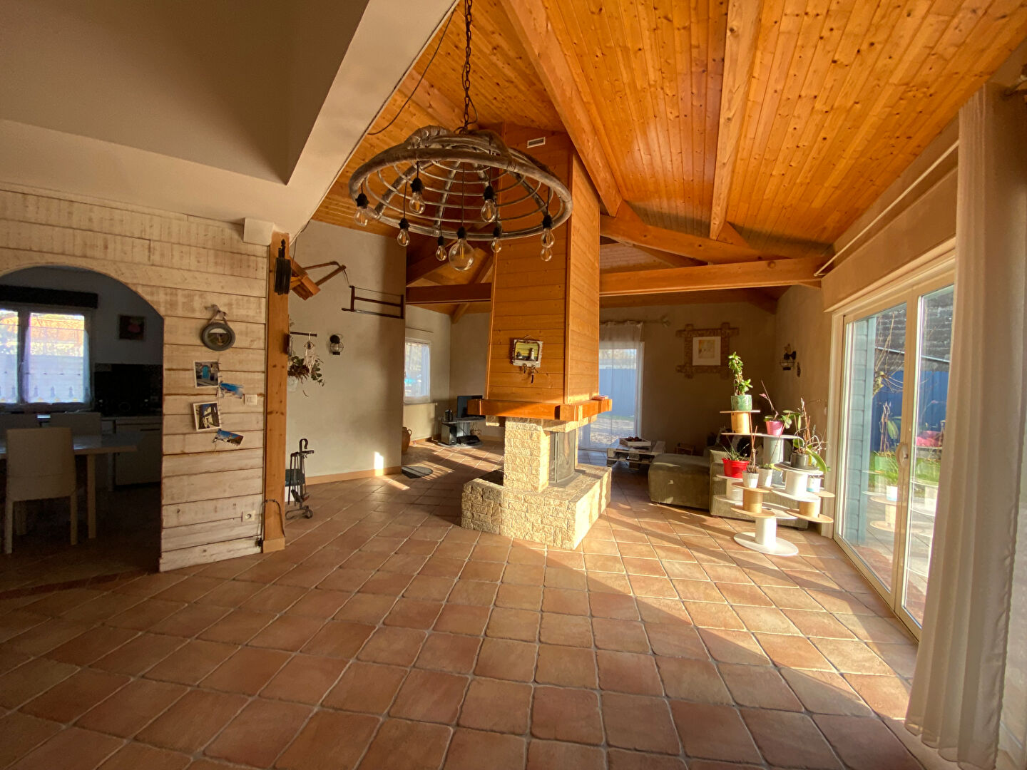 Elle offre une belle pièce de vie très lumineuse, avec cheminée centrale et plafond cathédrale, ouvrant sur une terrasse sans vis-à-vis bénéficiant d'une vue dégagée.