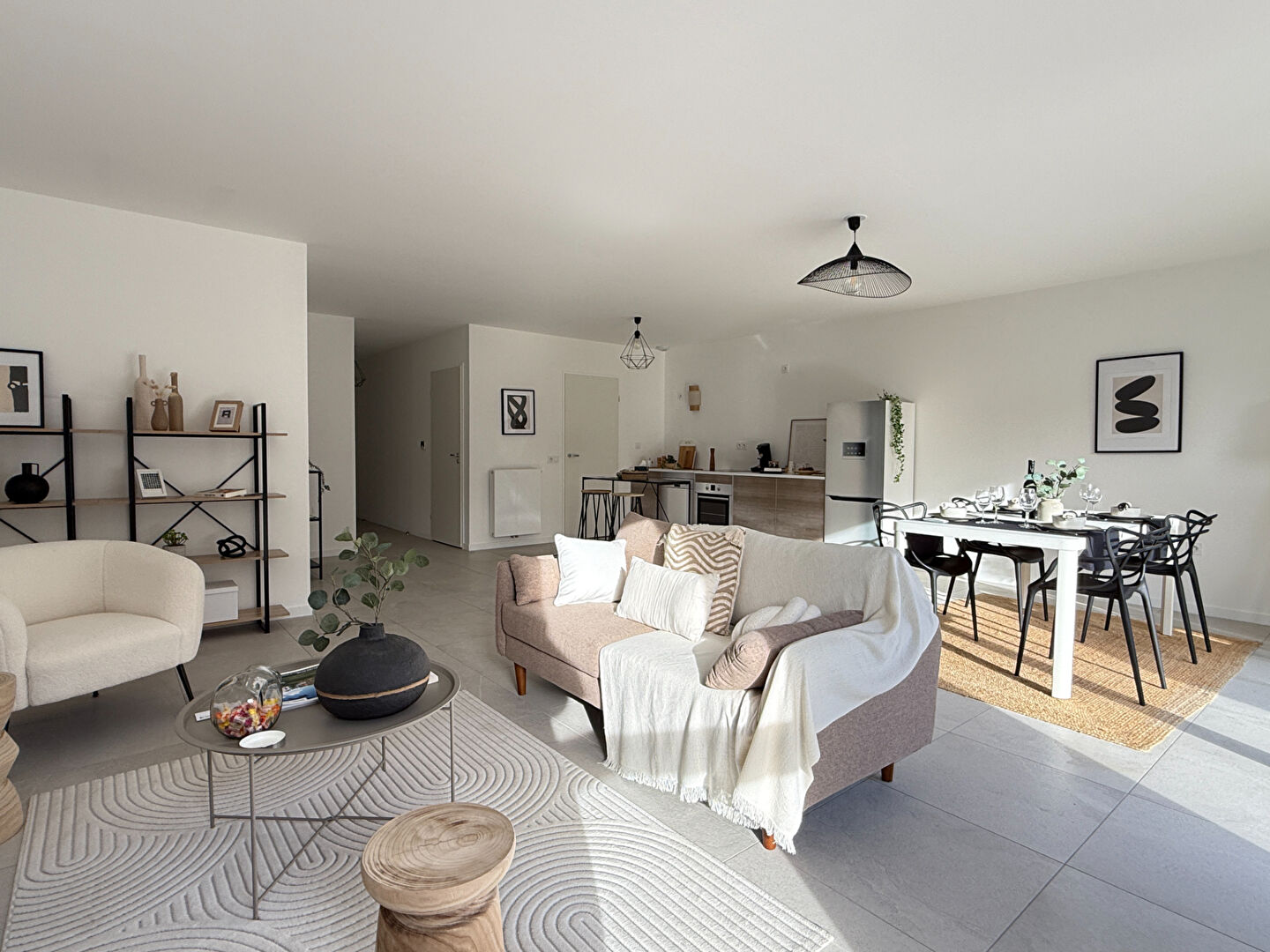 Maison de plain-pied, 87 m² habitables, grande pièce de vie de 38 m², lumineuse grâce à son exposition ouest, 3 chambres, dont une suite parentale avec salle d'eau privative, salle d'eau supplémentaire, plus 2 wc. Buanderie/cellier pour un rangement optimal. Terrasse en bois ouvrant sur un jardin privatif. Garage et un parking privative.