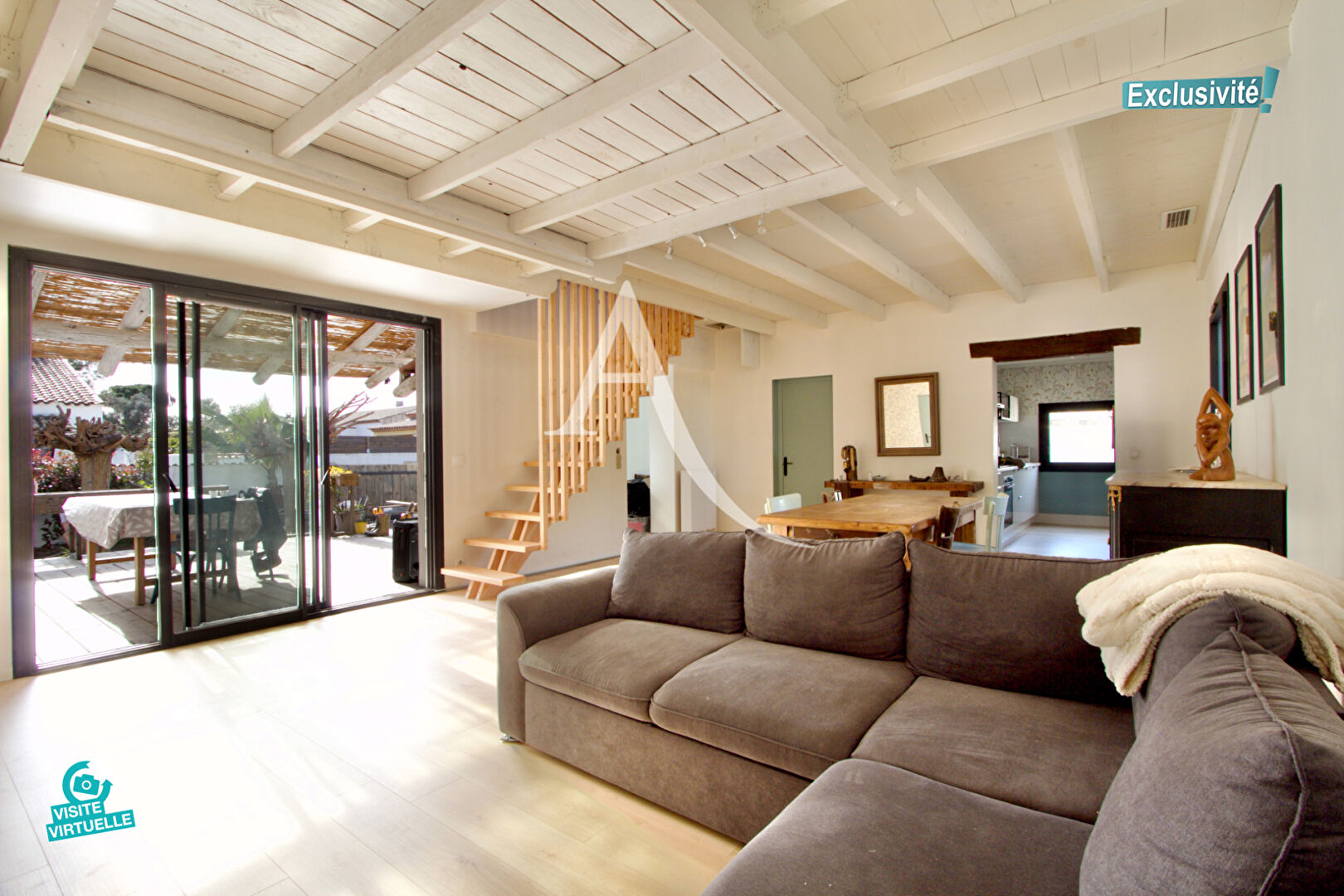 Au rez-de-chaussée, la porte s'ouvre sur un BEAU SÉJOUR intégrant une cuisine, et donnant accès à la terrasse de plus de 28 m2.