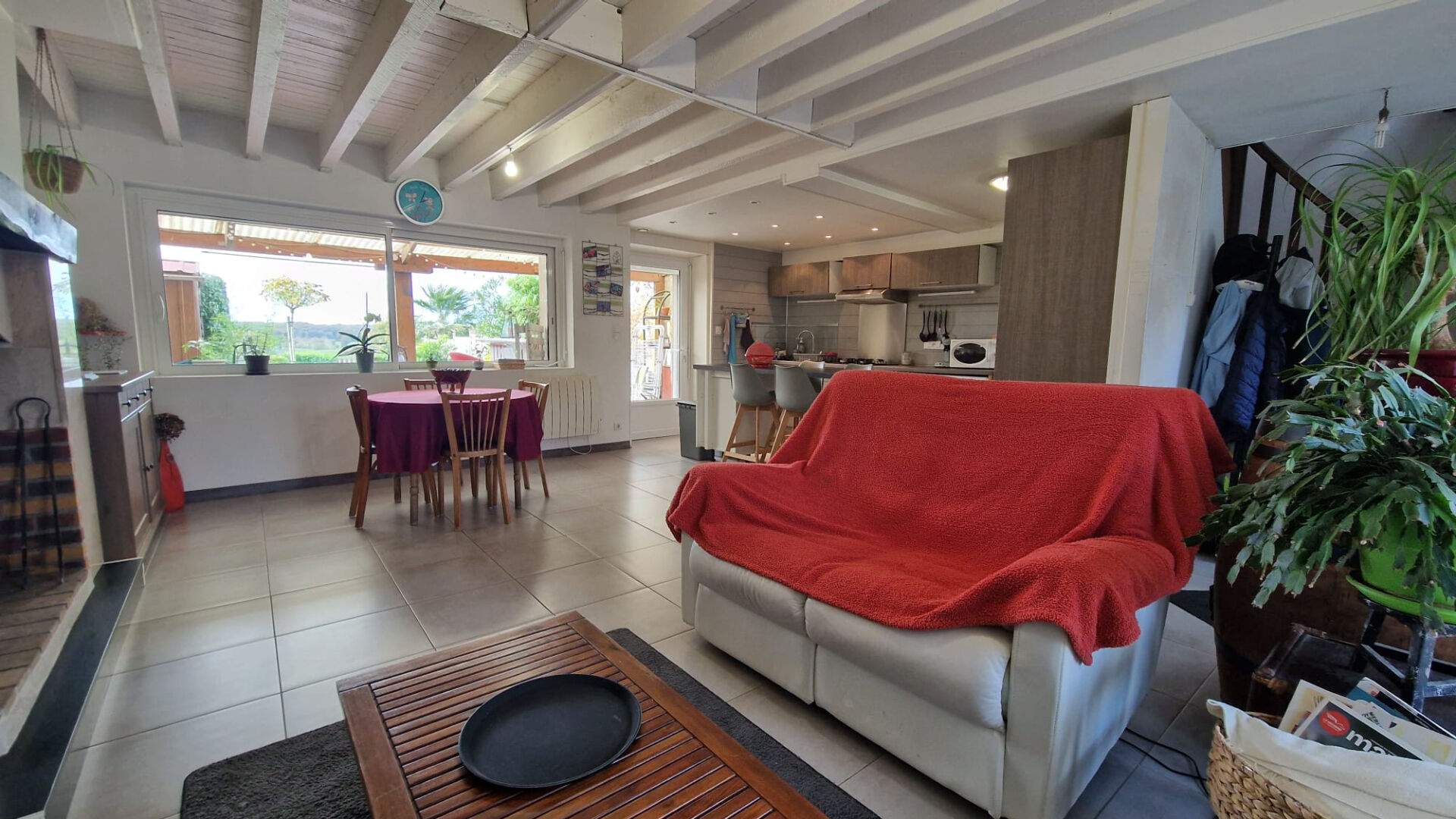 Au rez-de-chaussée, l'entrée mène à un séjour-salon chaleureux, agrémenté d'un insert intégré dans la cheminée, ainsi qu'à une cuisine ouverte sur la pièce de vie, idéale pour partager des moments conviviaux.