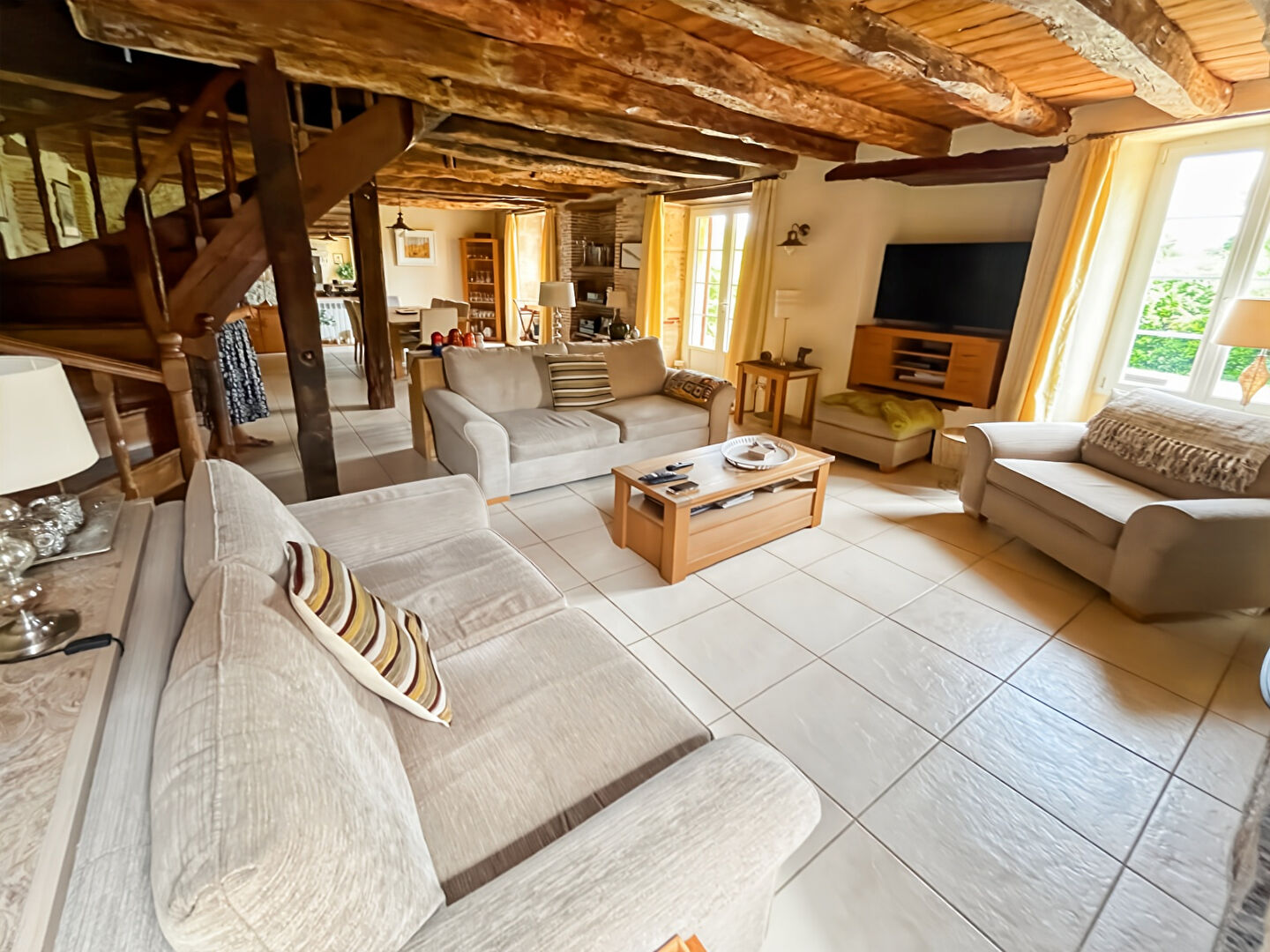 Dès l'entrée, un vaste séjour / salle à manger de 60 m², sublimé par une cheminée élégante et un accès terrasse avec vue campagne, La cuisine équipée avec accès jardin.