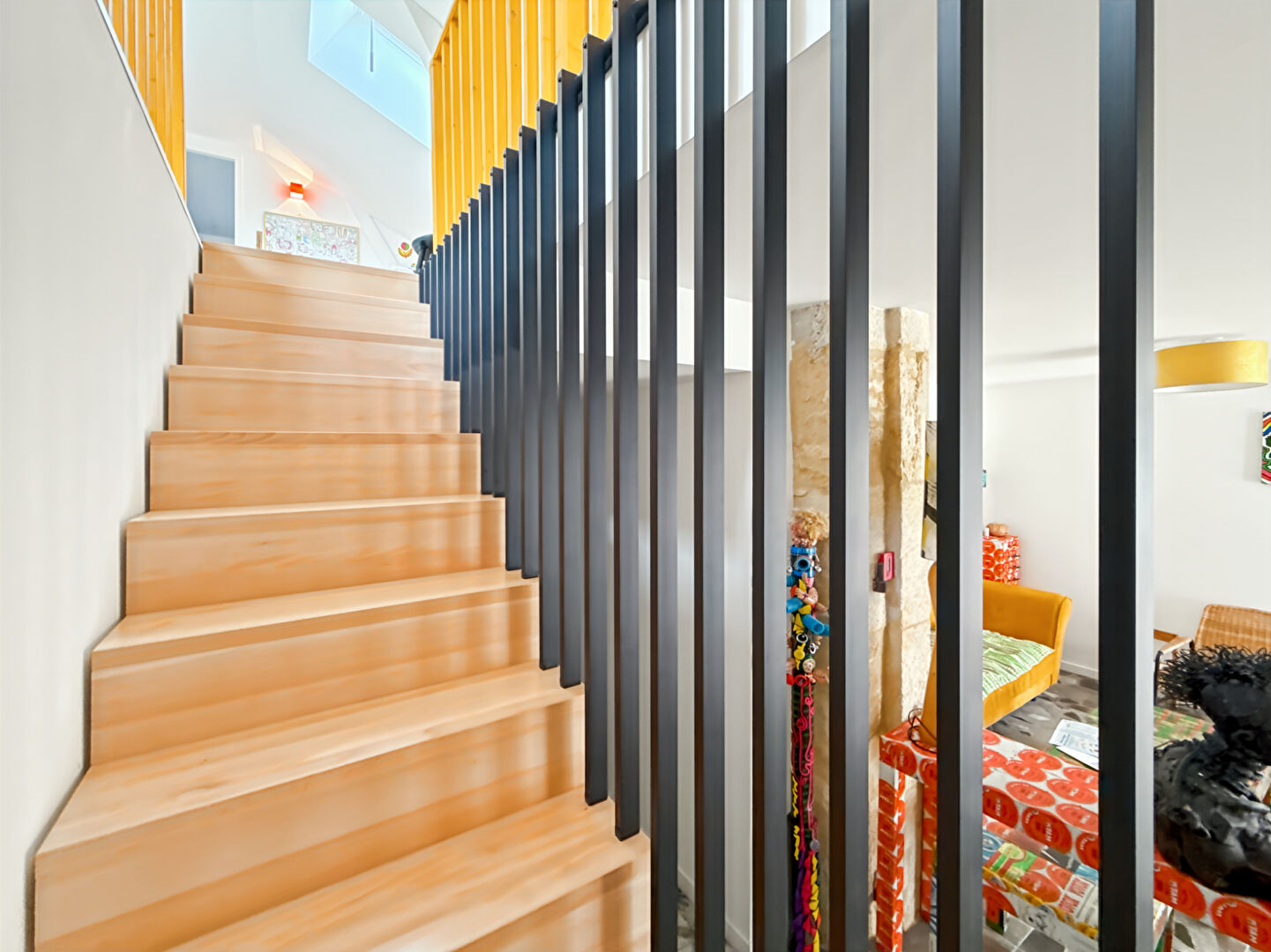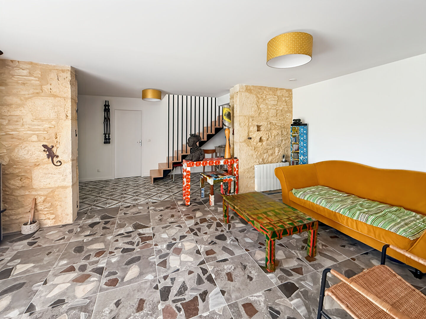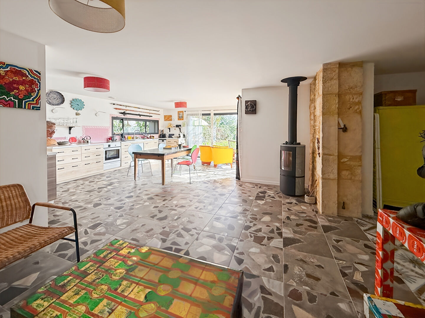 Vaste pièce de vie lumineuse : salon, cuisine ouverte et salle à manger