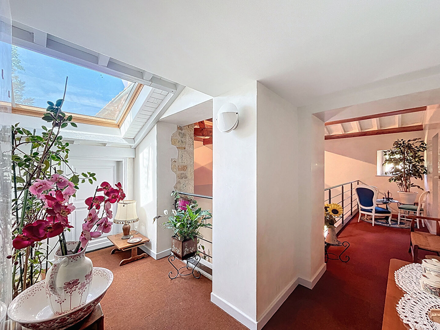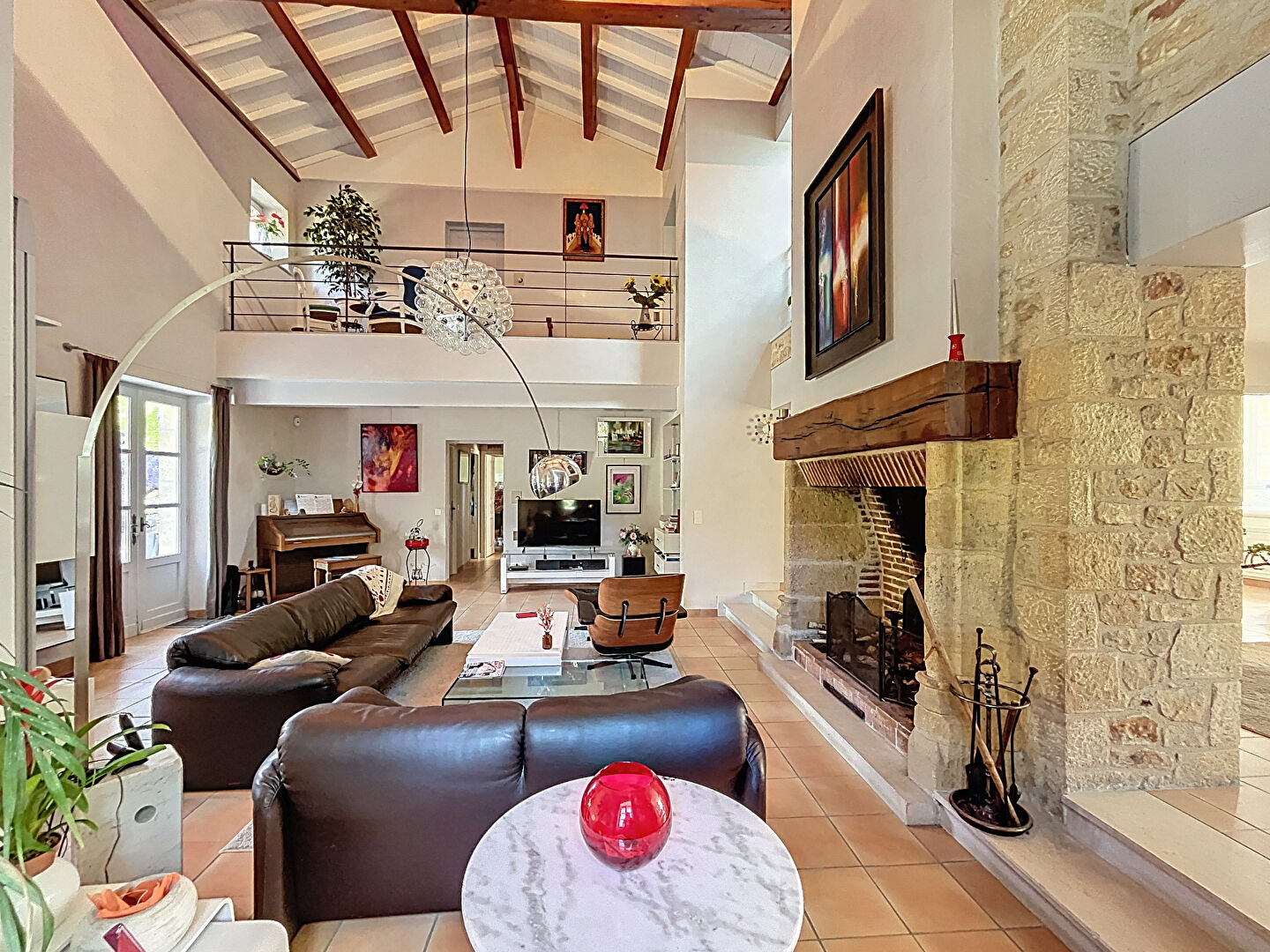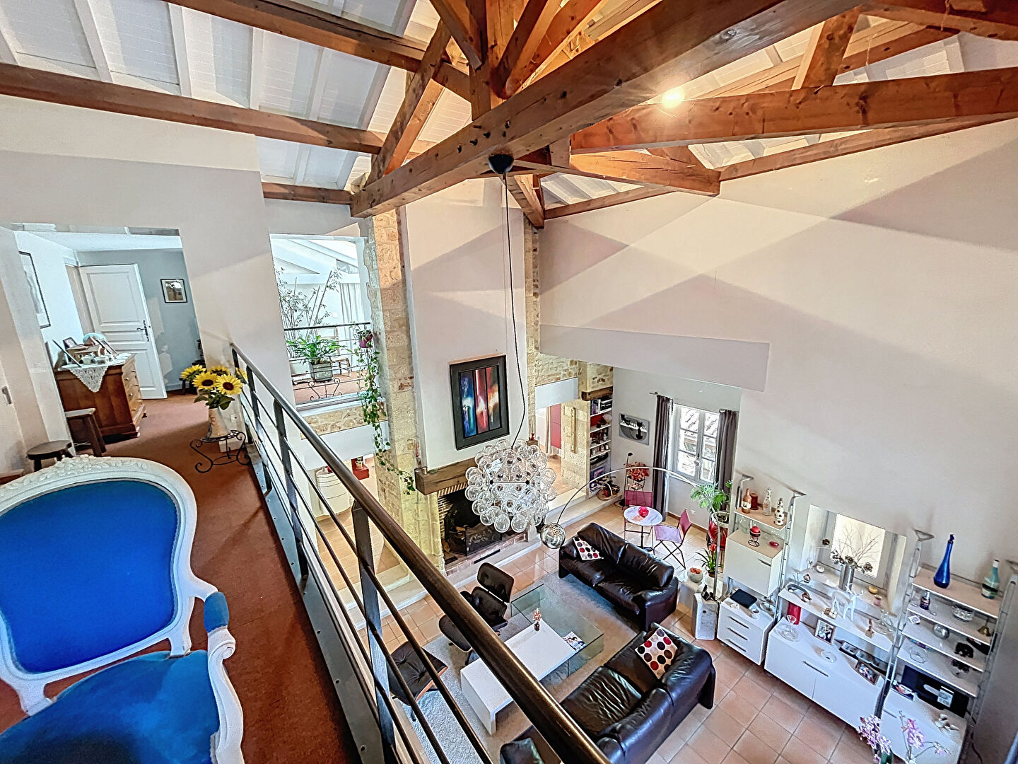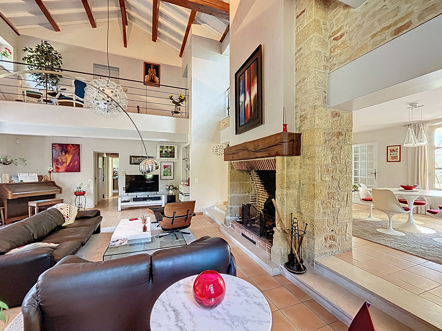 Entrée sur hall ouvrant sur un espace de réception aux belles hauteurs sous plafond, sublimé par une cheminée.