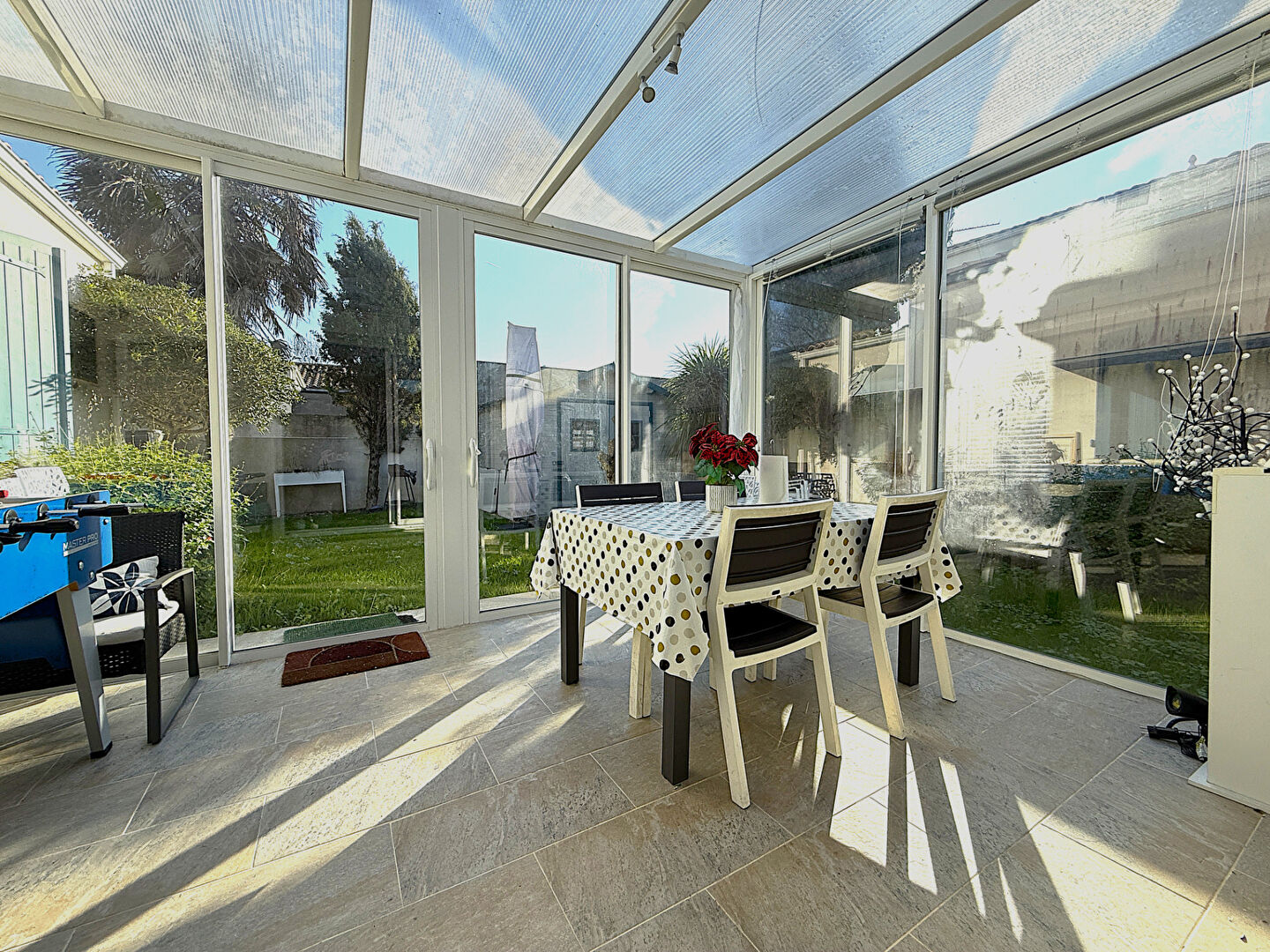 Puilboreau, maison de plain-pied offrant un espace de vie de plus de 52 m² (cuisine équipée-salon-séjour) donnant sur une véranda chauffée baignée de lumière et accès direct sur le jardin exposé plein sud sans vis-à-vis, 4 chambres avec placard, salle de bains, salle d'eau, 2 wc, une arrière cuisine avec accès au garage. A proximité des commerces et de l'arrêt de bus.