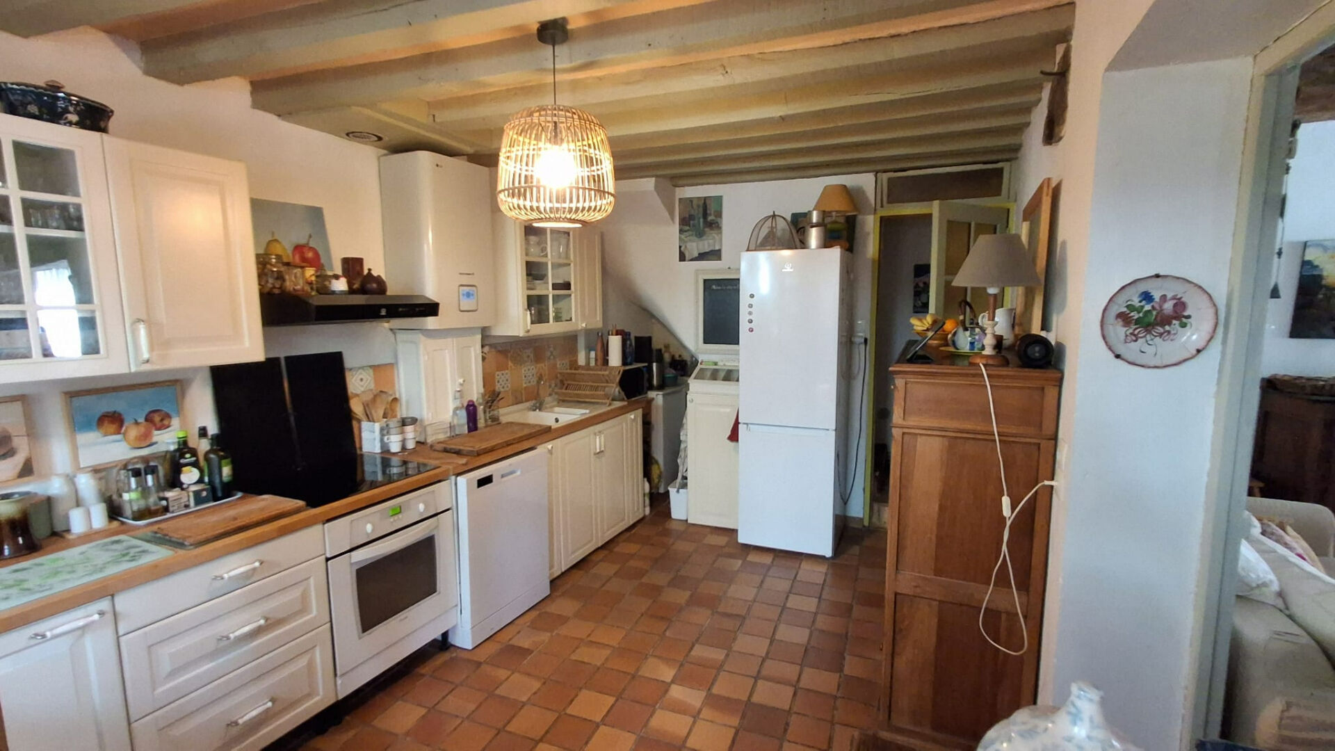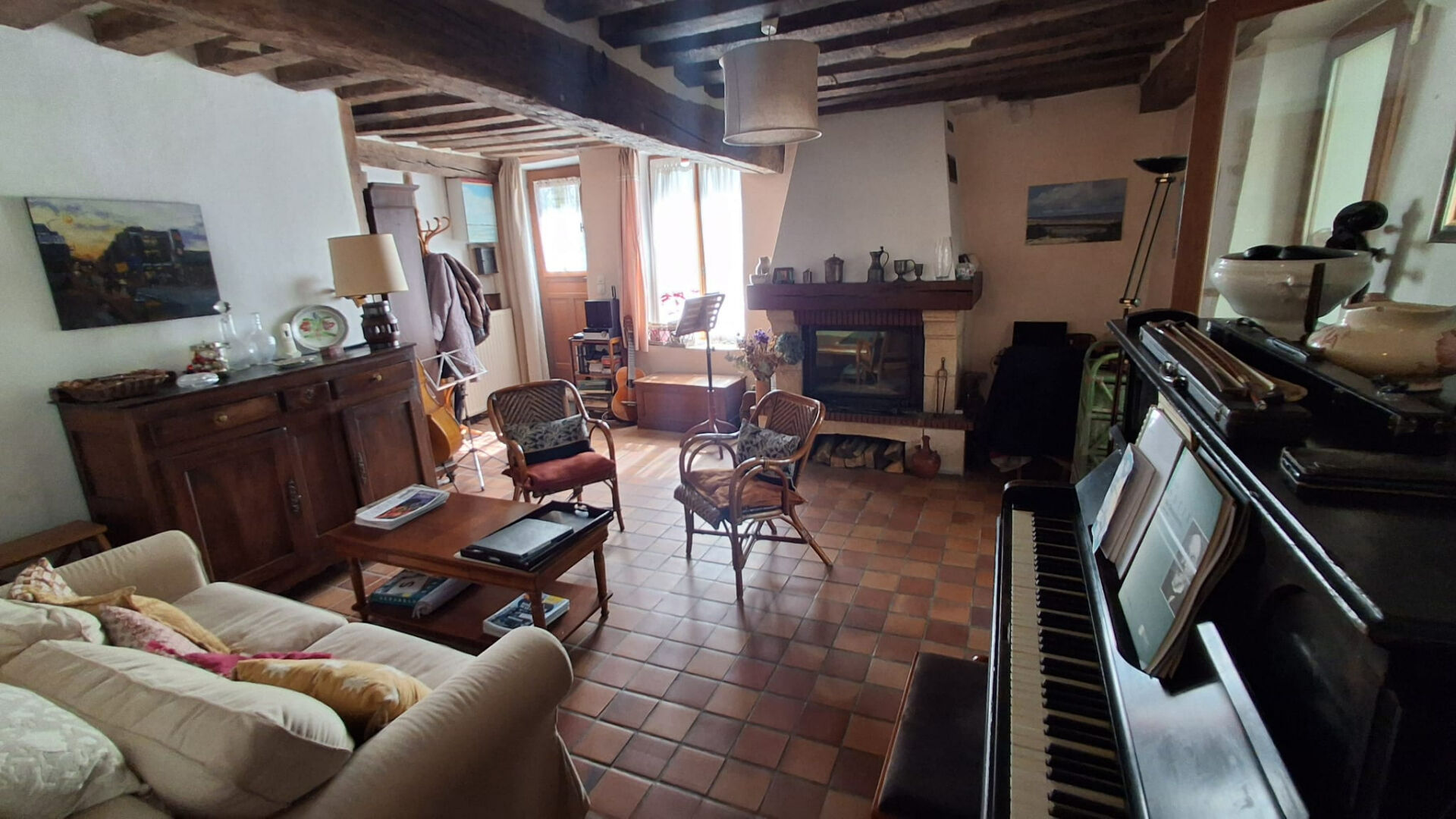 Dès les premiers instants, le charme opère. Le salon, chaleureux et lumineux, s'articule autour d'une **cheminée** qui promet de beaux moments en toute saison. La cuisine, fonctionnelle et conviviale, devient naturellement un lieu de partage au quotidien.