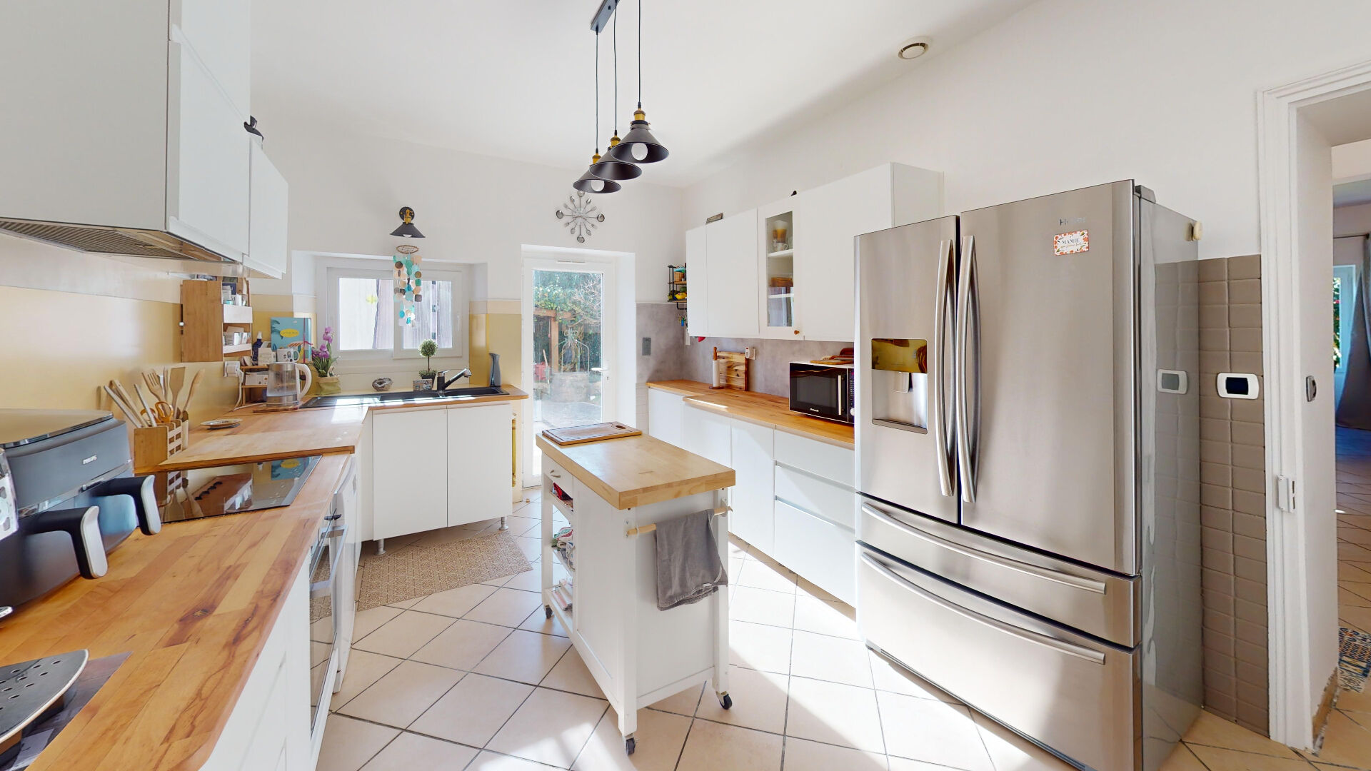 Côté équipements, cette maison allie confort et économies d'énergie grâce à ses panneaux photovoltaïques destinés à l'autoconsommation, un chauffage centralisé avec chaudière à granulés et un ballon thermodynamique.
