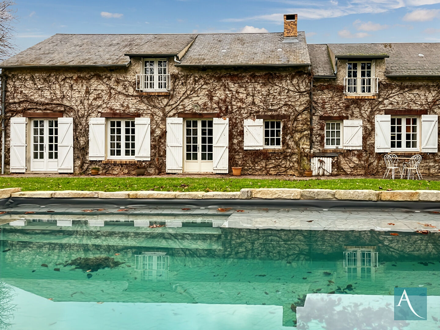 Les extérieurs charmants, illustrés sur les photos, dévoilent une façade en pierre couverte de végétation, des volets blancs et une piscine chauffée de 5 mètres sur 8 qui s'intègre parfaitement dans cet environnement bucolique.