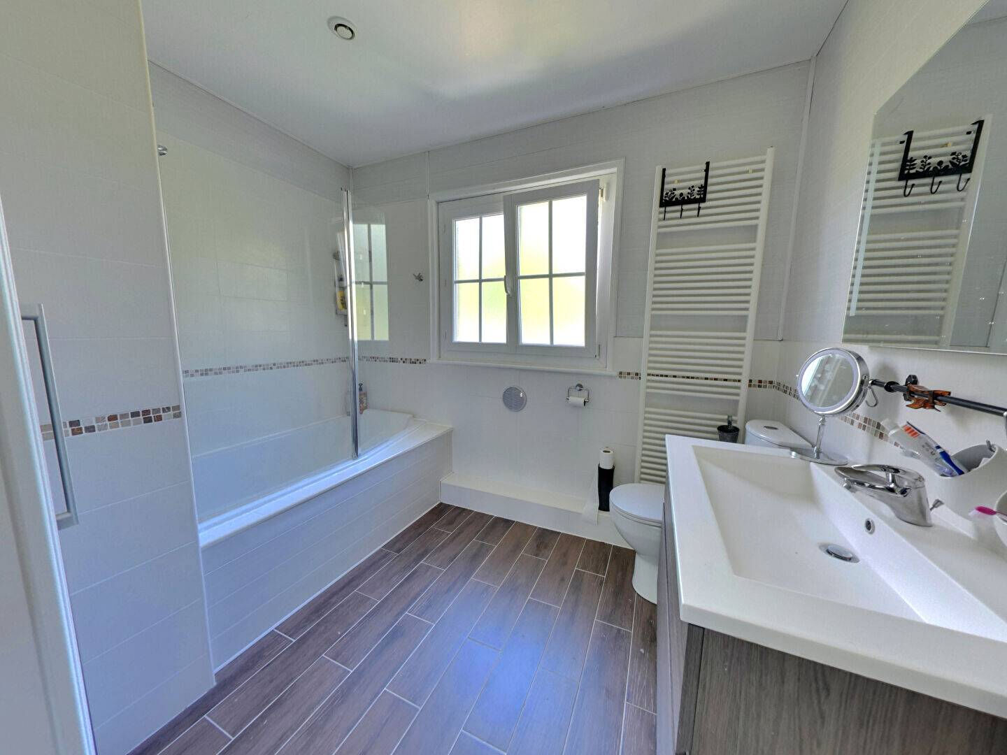 À l'étage, le palier dessert trois chambres avec placards, ainsi qu'une salle de bains avec WC, qui vient compléter cet espace nuit.