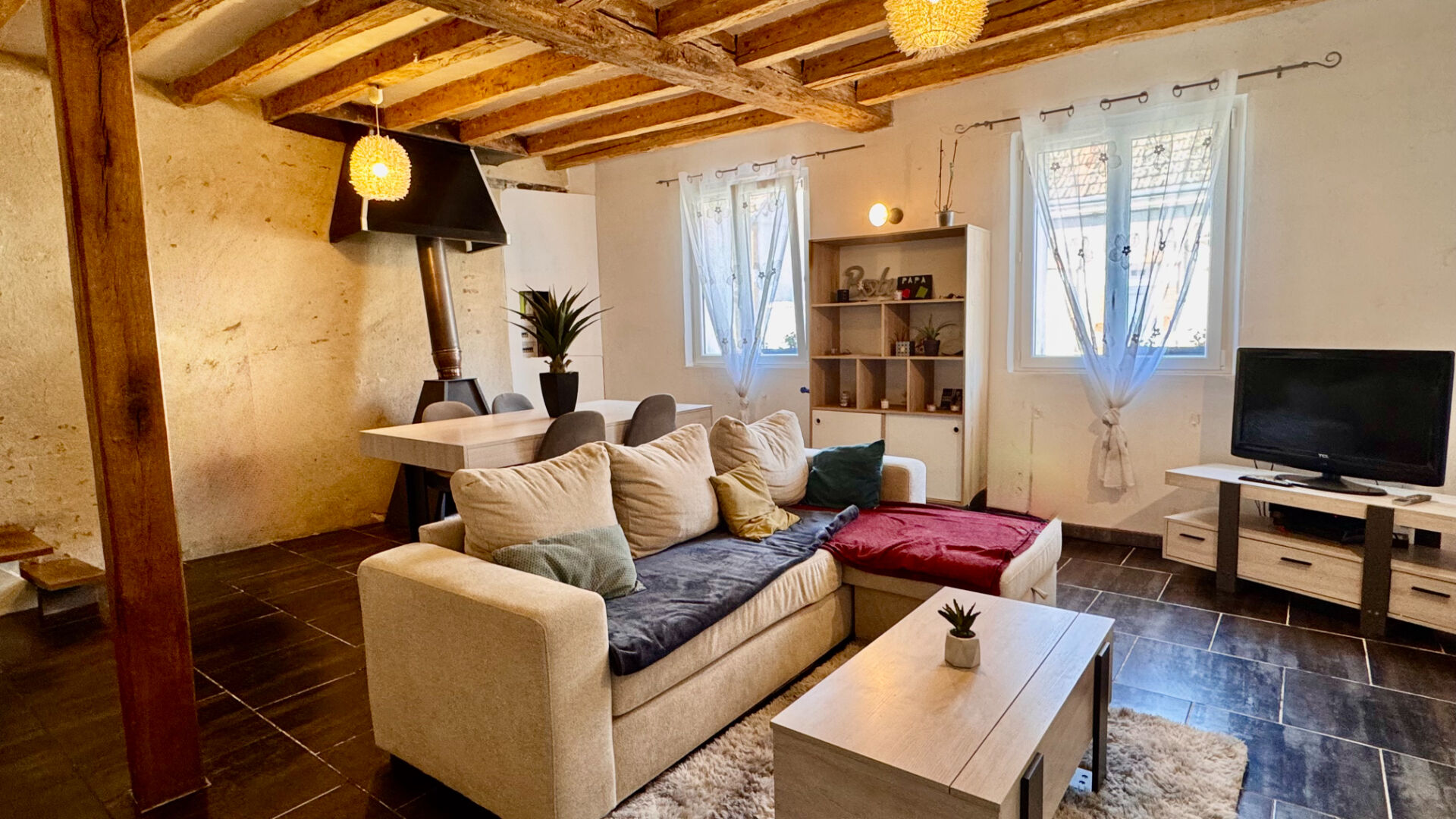 ROMORANTIN LANTHENAY - 10mn à pied des premiers commerces - Cette agréable maison de ville, pleine de caractère, avec ses pierres apparentes et ses poutres, offre une atmosphère chaleureuse - Cuisine accueillante équipée et fonctionnelle ouverte sur un séjour avec mezzanine, offrant un espace supplémentaire idéal pour un bureau - Salon agrémenté d'un poêle à bois - Atout supplémentaire : suite parentale de 31m² avec sa salle de bains privative et pièce dressing (le tout en cours de travaux) donnant sur terrasse privative.