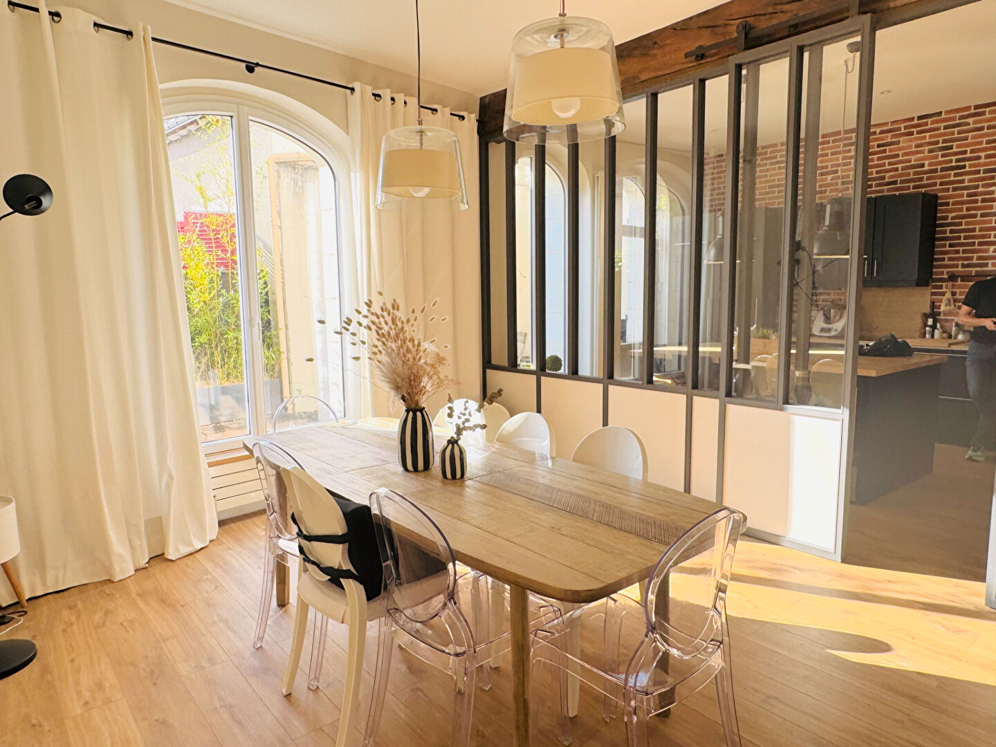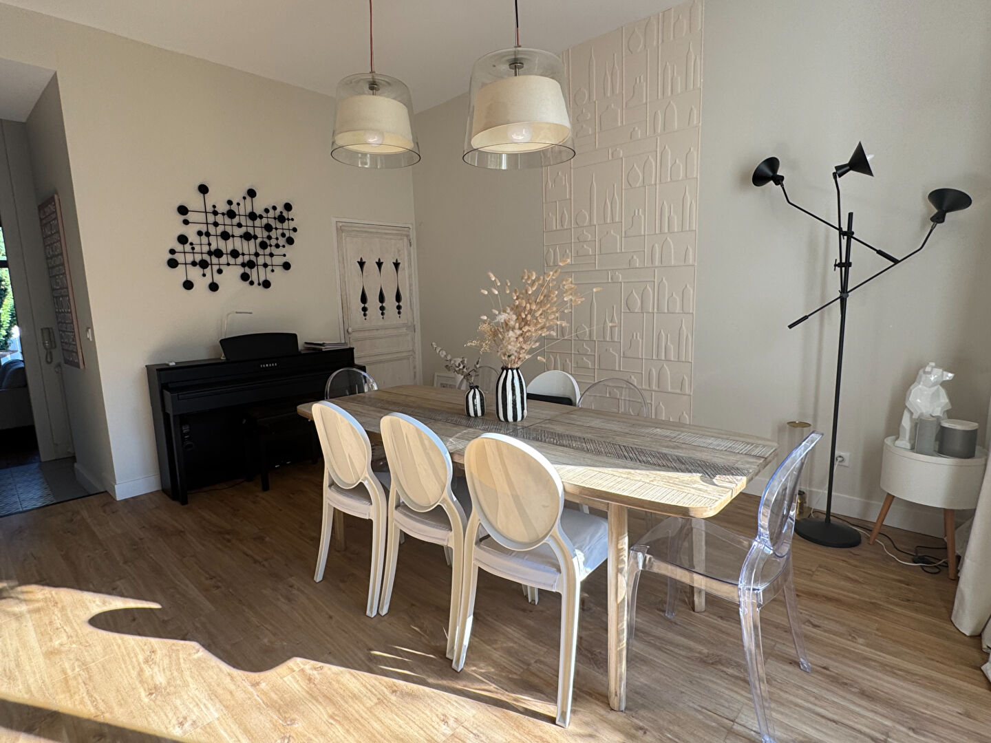 La pièce à vivre, composée d'une salle à manger et d'une cuisine entièrement aménagée équipée, ouverte mais qui peut se transformer en espace fermé grâce à une verrière coulissante, s'ouvre sur une terrasse intime.