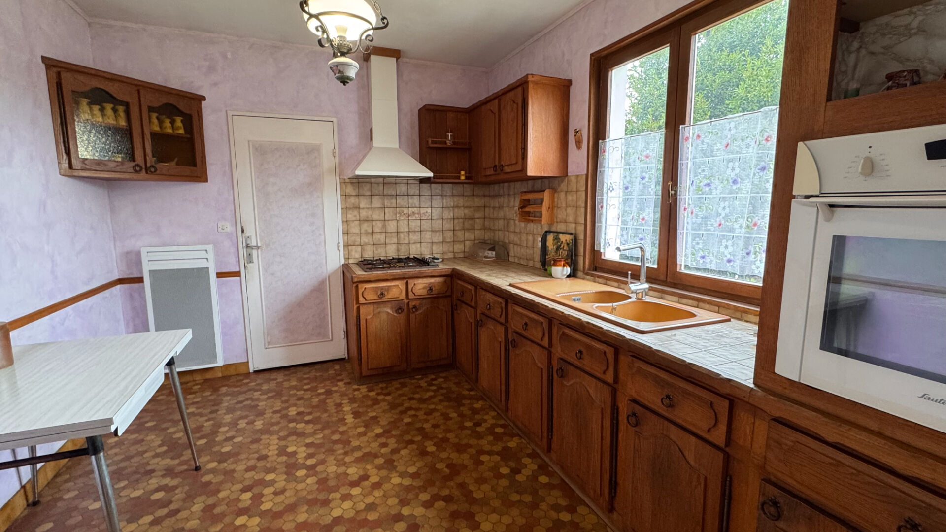 Une entrée dessert une cuisine aménagée (possibilité de créer une cuisine ouverte) un séjour salon avec cheminée insert et un wc - à la suite : dégagement 3 chambres avec placards, salle d'eau.