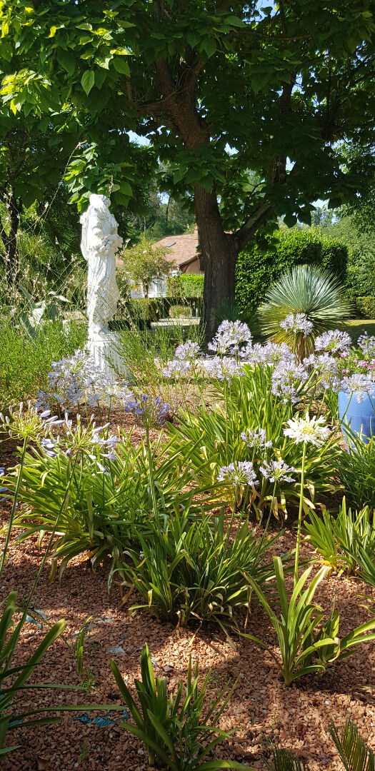 Un jardin aux accents méditerranéens planté de palmiers, agapanthes et oliviers.