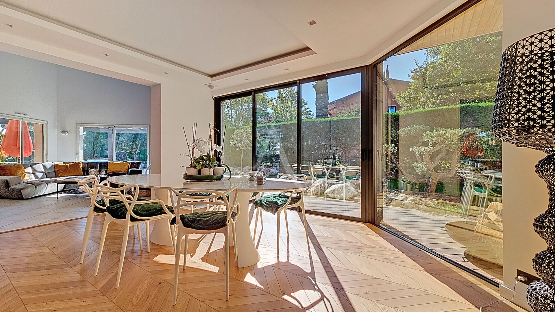 Située à Rouffiac-Tolosan, cette belle villa moderne et confortable type 7 de 240m2 habitables est au calme, sans vis à vis. L'entrée de caractère avec vue d'ensemble sur piscine et jardin dessert une superbe pièce de vie de 80m2 composée et salon avec cheminée, une cuisine us haut de gamme, parfaitement équipée et d'un véritable espace repas parfait pour recevoir.