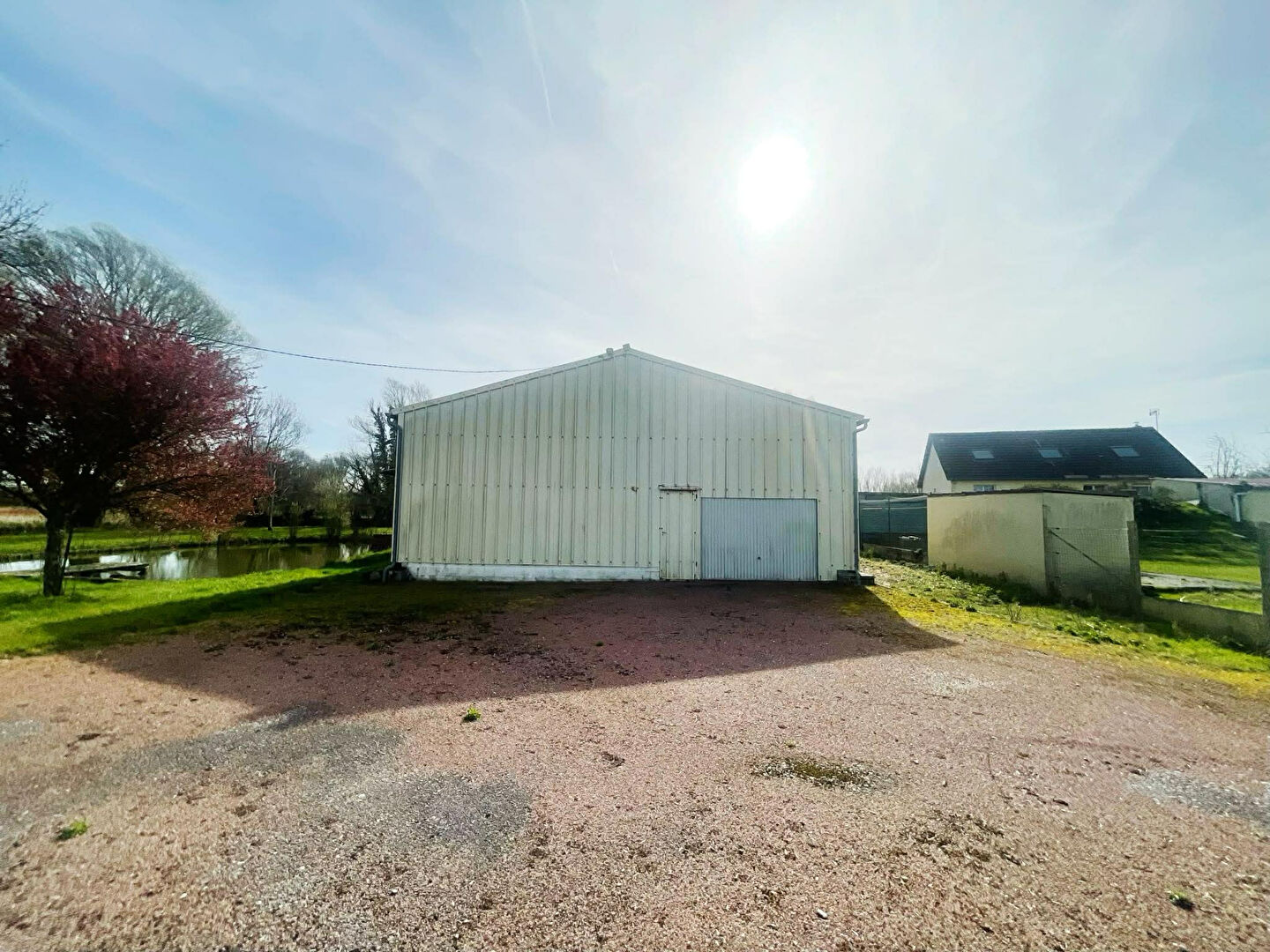 En plus de la maison, un jardin avec étang, et un grand hangar d'environ 300m² au sol.