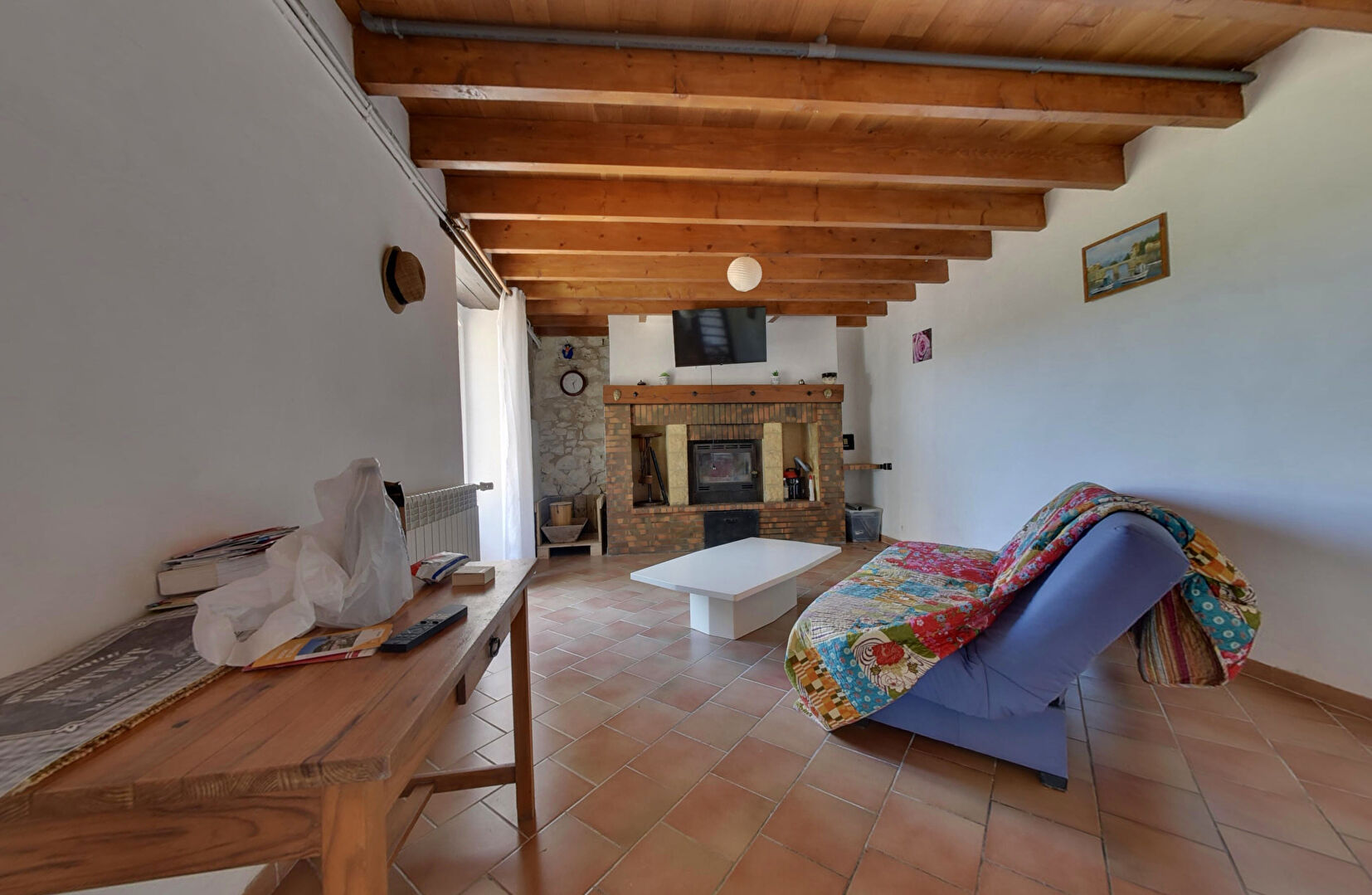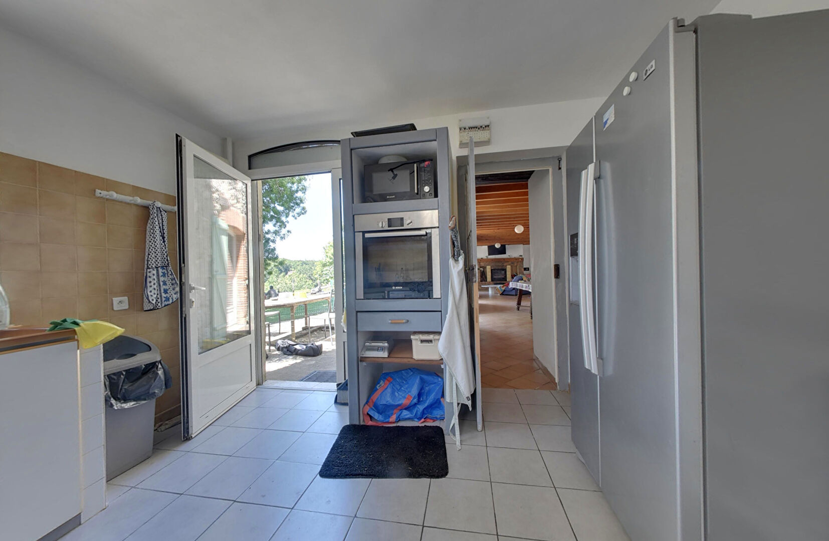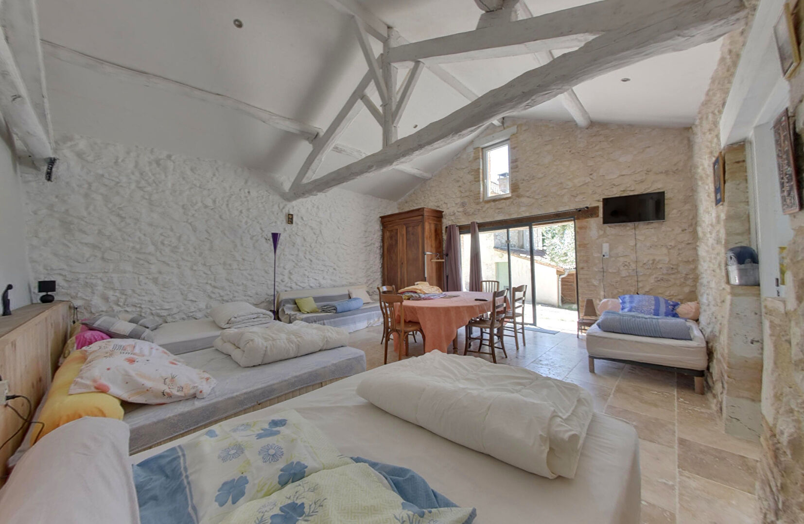 Configurée tant pour une vie familiale que pour une exploitation commerciale ( gîte, accueil de pèlerins de compostelle ), une grande salle de séjour jouxte une cuisine équipée, l'ensemble donnant accès directement sur la terrasse arborée.